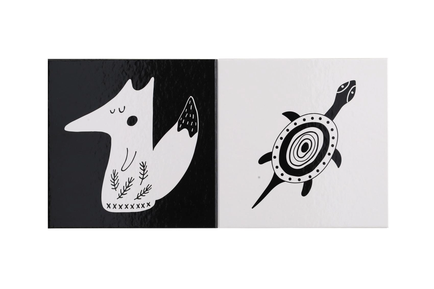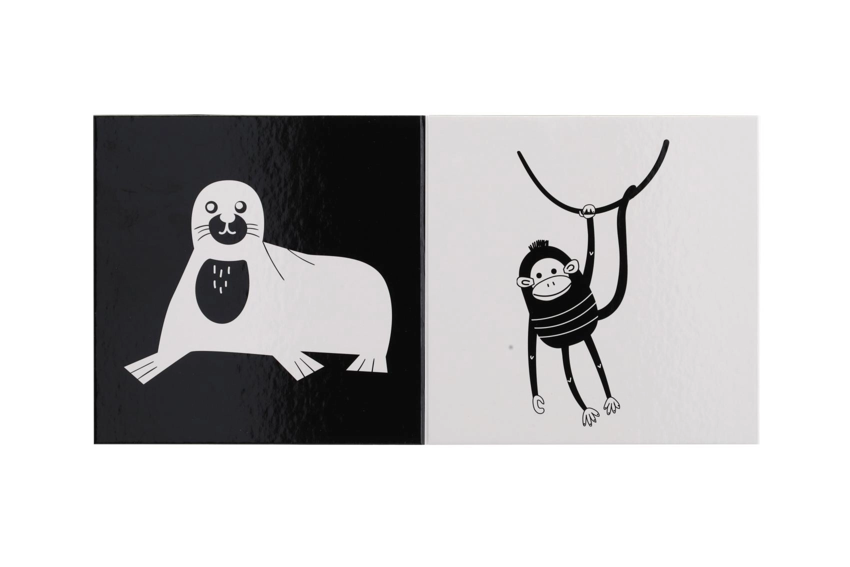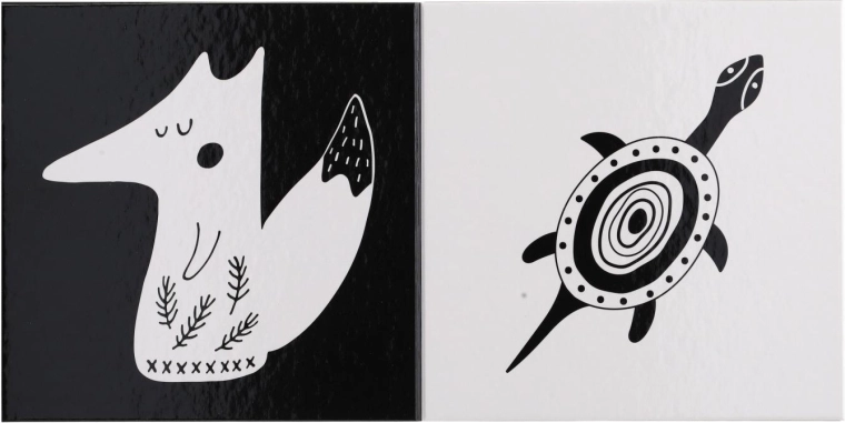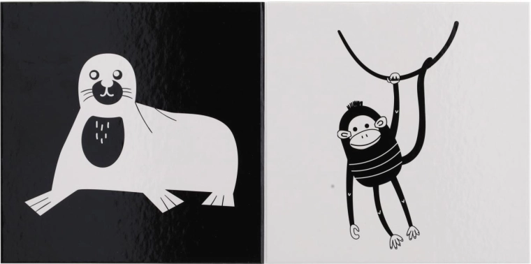 Ez a kontrasztos leporelló újszülöttek és csecsemők számára készült, akik a legegyszerűbb formákat és az élénk, kontrasztos színeket érzékelik a legjobban. A fekete-fehér, nagy kontrasztú állatillusztrációk természetesen megragadják a figyelmet, elősegítik a koncentrációt és a vizuális észlelés fejlődését.