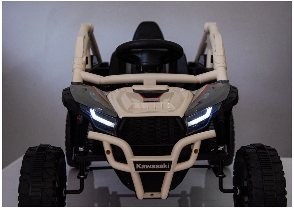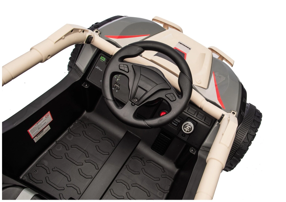 Élvezd az akciódús kirándulásokat a KAWASAKI JS330 gyerek járművel. Az UTV/buggy stílus, a széles nyomtáv és a részletes felfüggesztés stabilitást ad egyenetlen terepen is. A belső tér kormánnyal, indítógombbal és jól áttekinthető kapcsolókkal valósághű vezetési élményt nyújt.