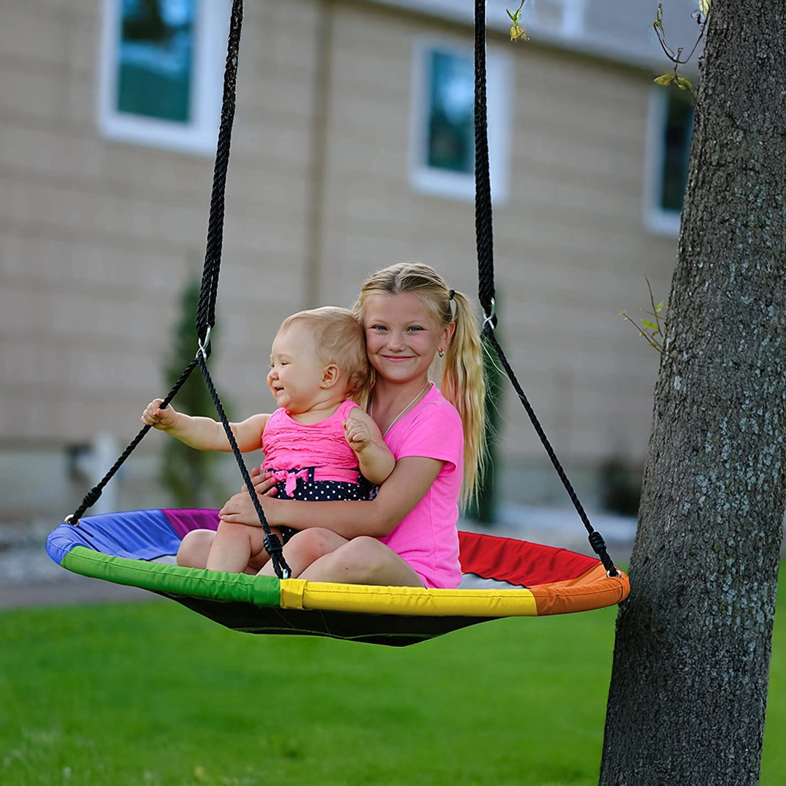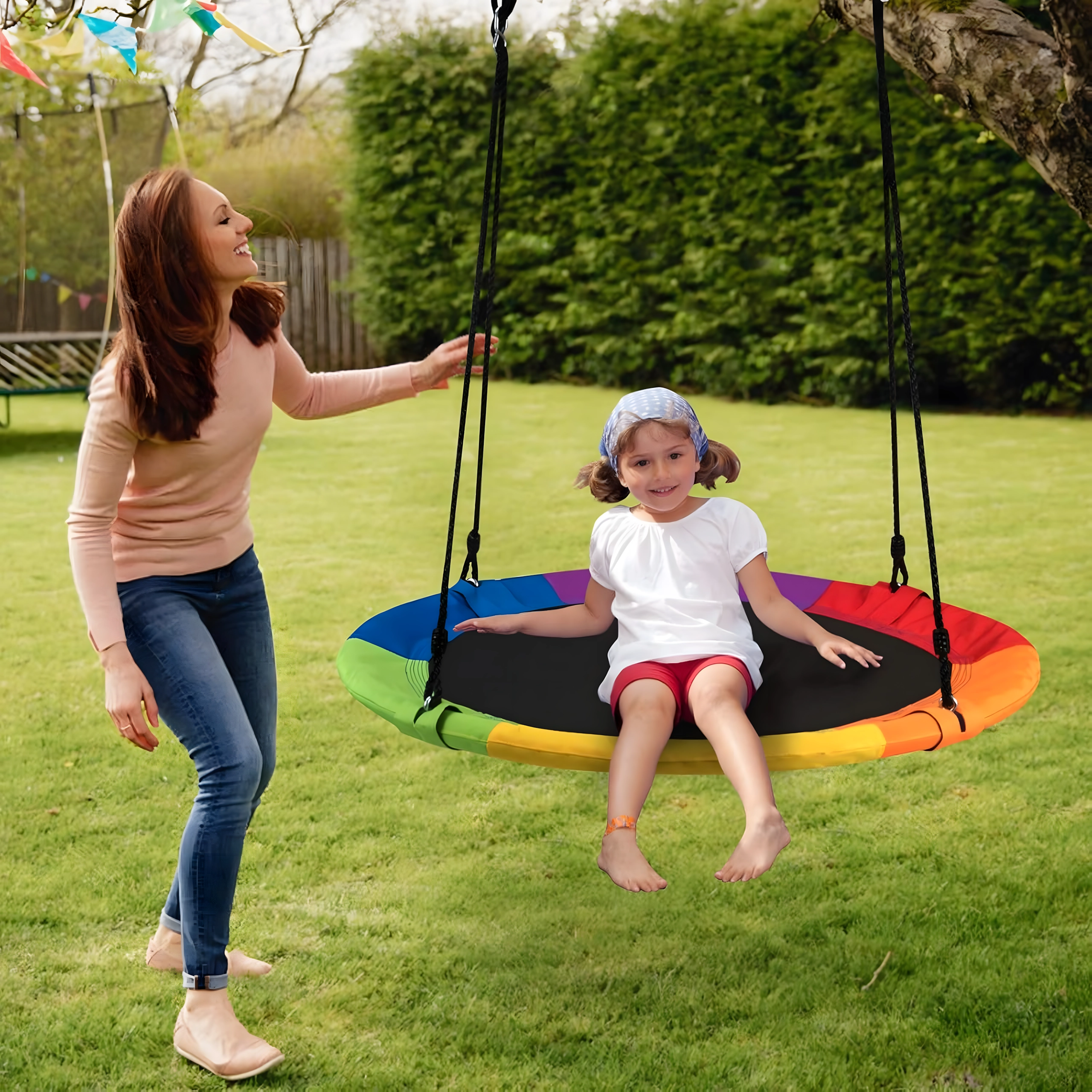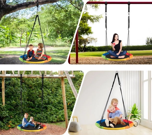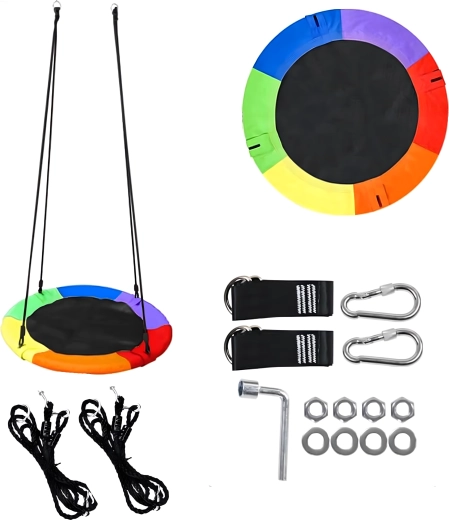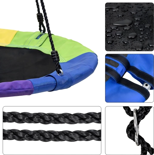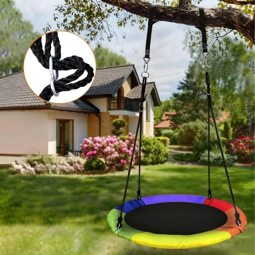 A 100 cm átmérőjű, gólyafészek típusú nagy körhinta órákon át tartó kinti szórakozást és pihenést nyújt a gyerekeknek. A széles ülőfelületnek köszönhetően ülésre és fekvésre is ideális, egyszerre több gyereket is elbír, és erős, fonott kötelekkel, strapabíró szövettel és fém karabinerekkel rendelkezik a biztonságos felfüggesztéshez. A csomag tartalmaz fákra rögzíthető hevedereket és minden szükséges tartozékot.