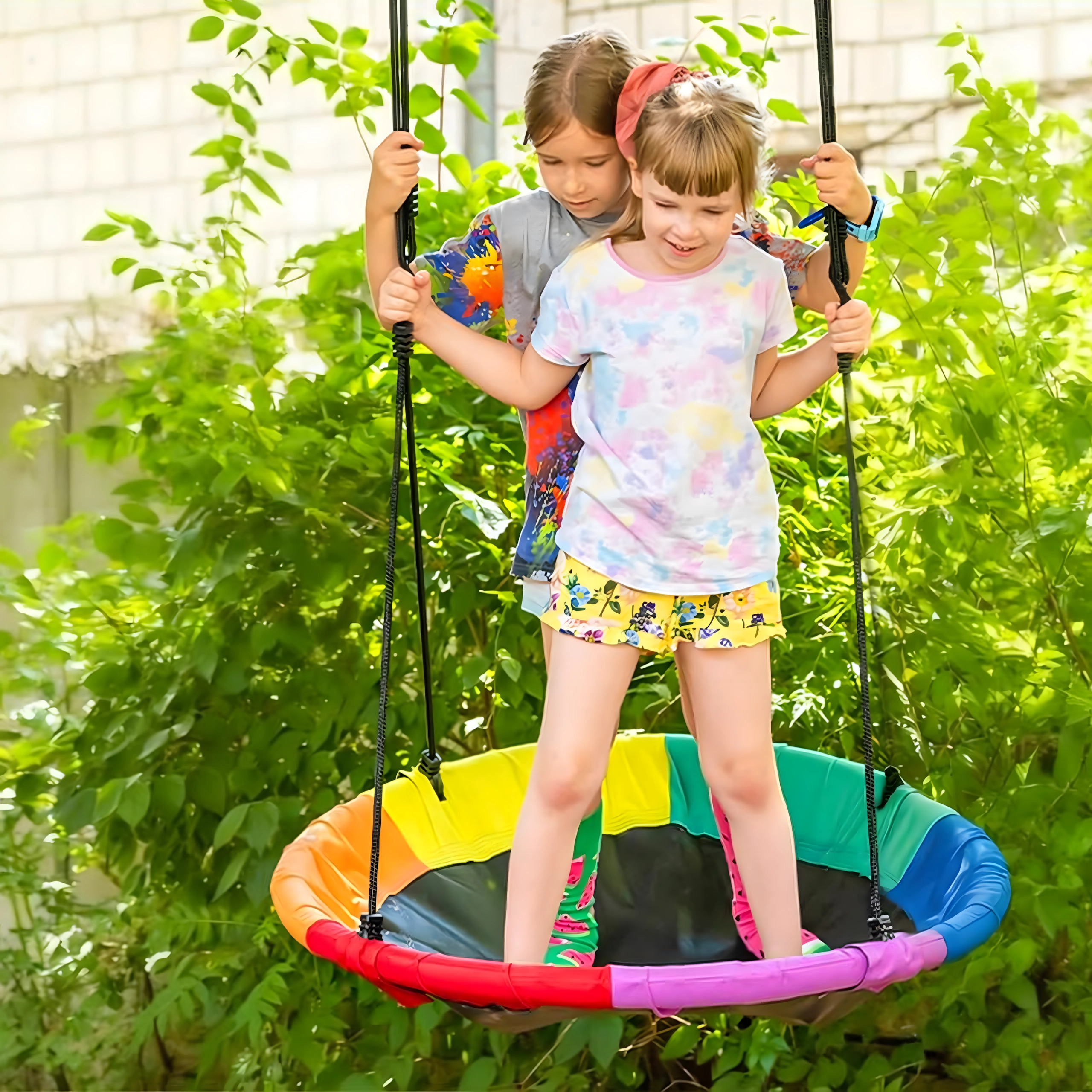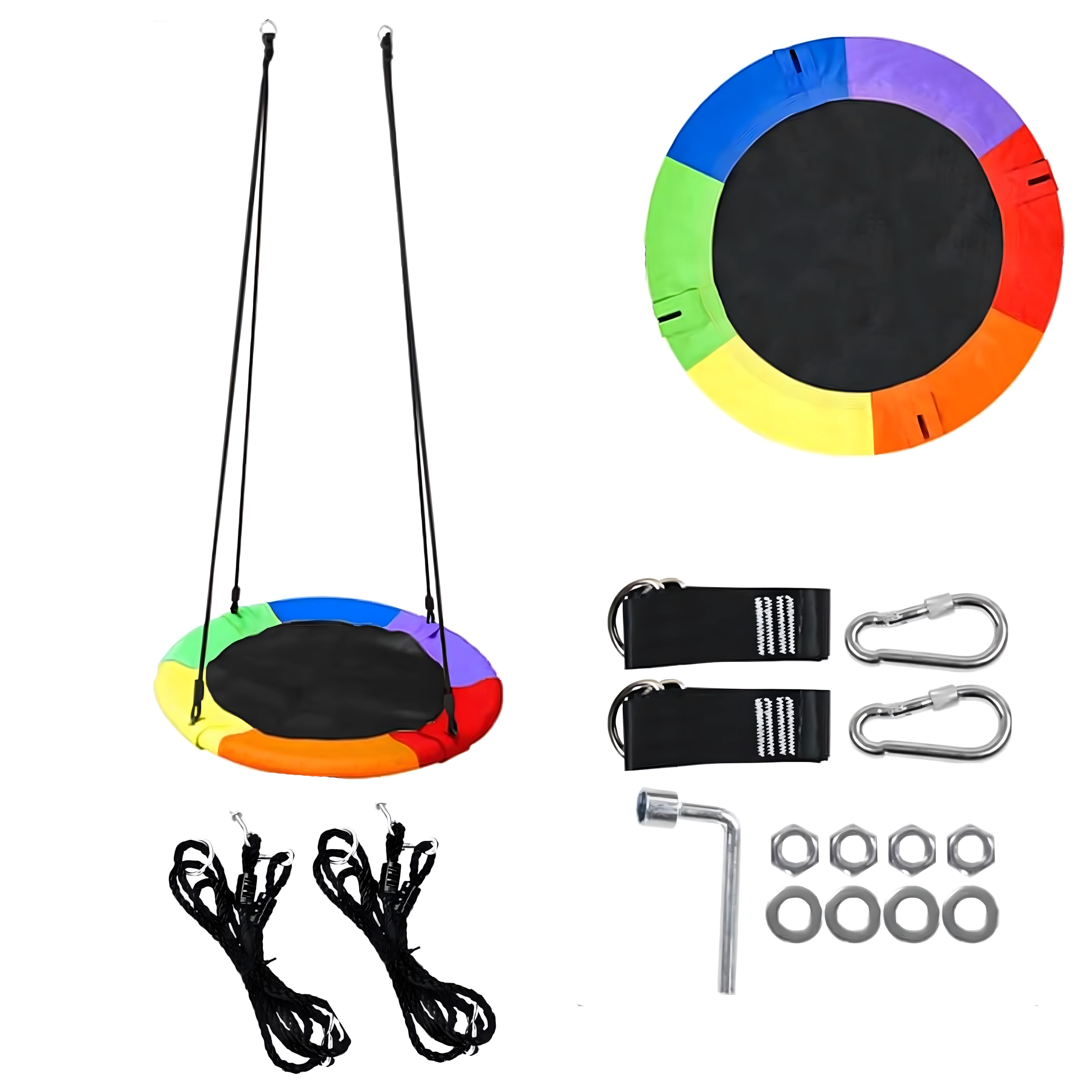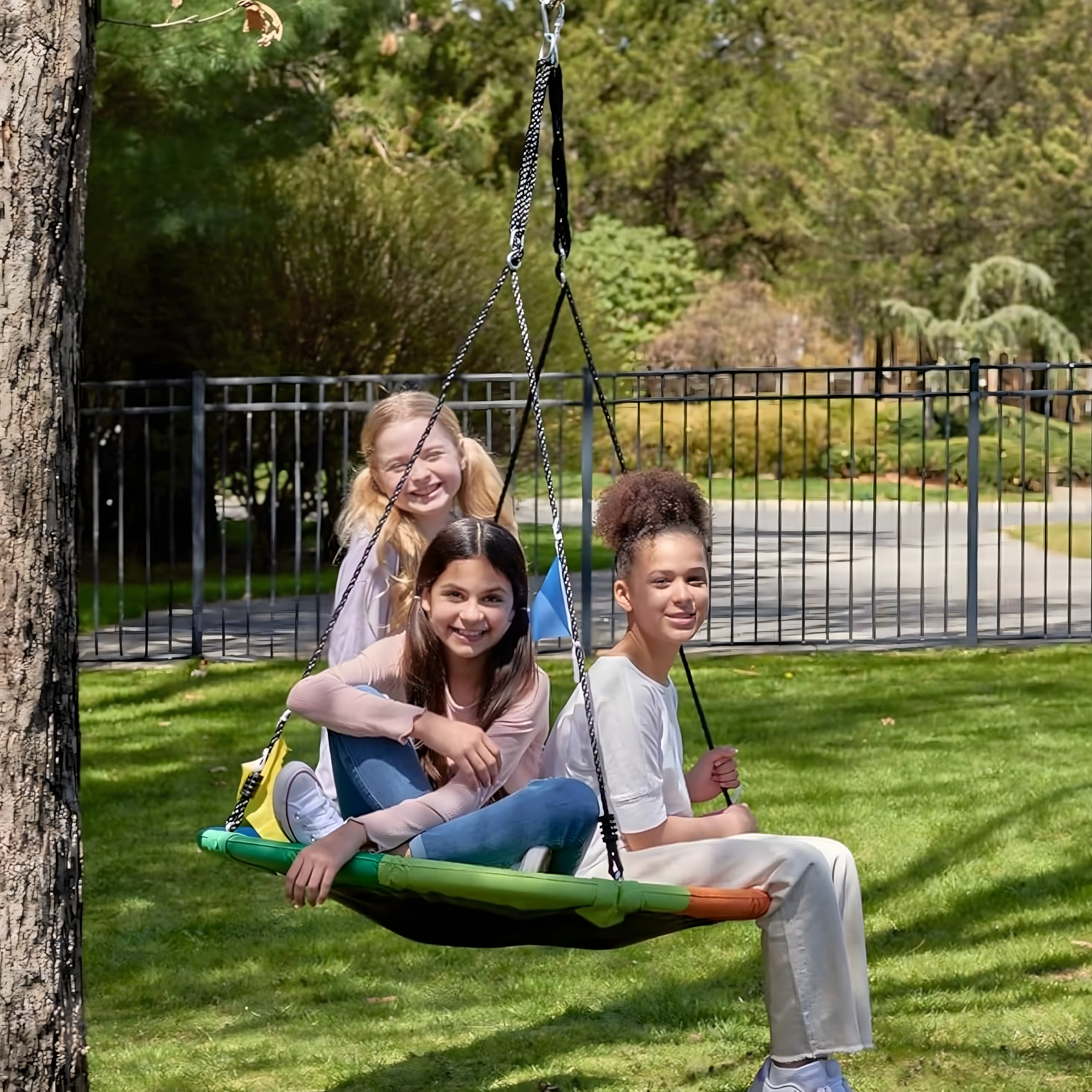A 100 cm átmérőjű, gólyafészek típusú nagy körhinta órákon át tartó kinti szórakozást és pihenést nyújt a gyerekeknek. A széles ülőfelületnek köszönhetően ülésre és fekvésre is ideális, egyszerre több gyereket is elbír, és erős, fonott kötelekkel, strapabíró szövettel és fém karabinerekkel rendelkezik a biztonságos felfüggesztéshez. A csomag tartalmaz fákra rögzíthető hevedereket és minden szükséges tartozékot.