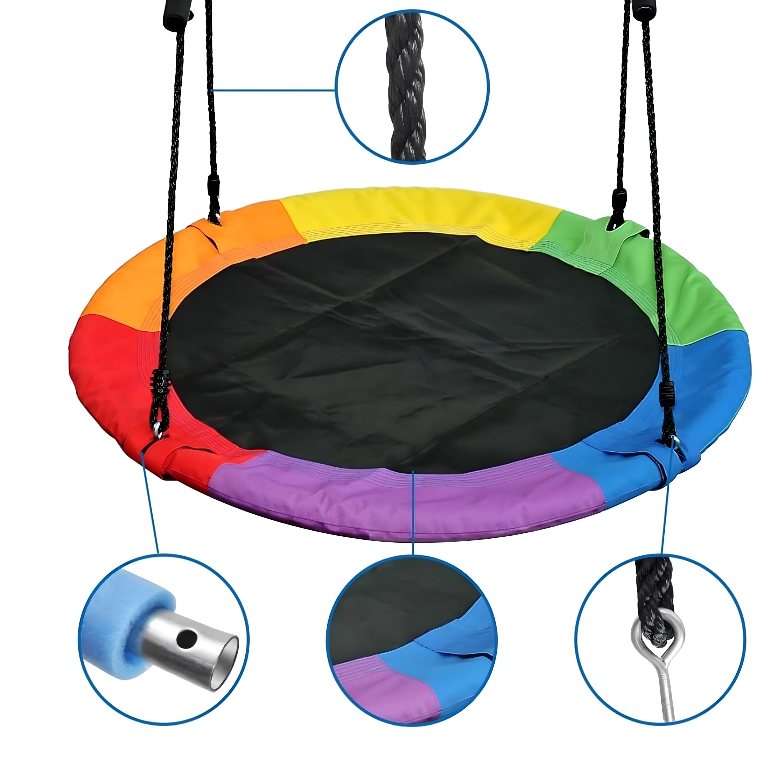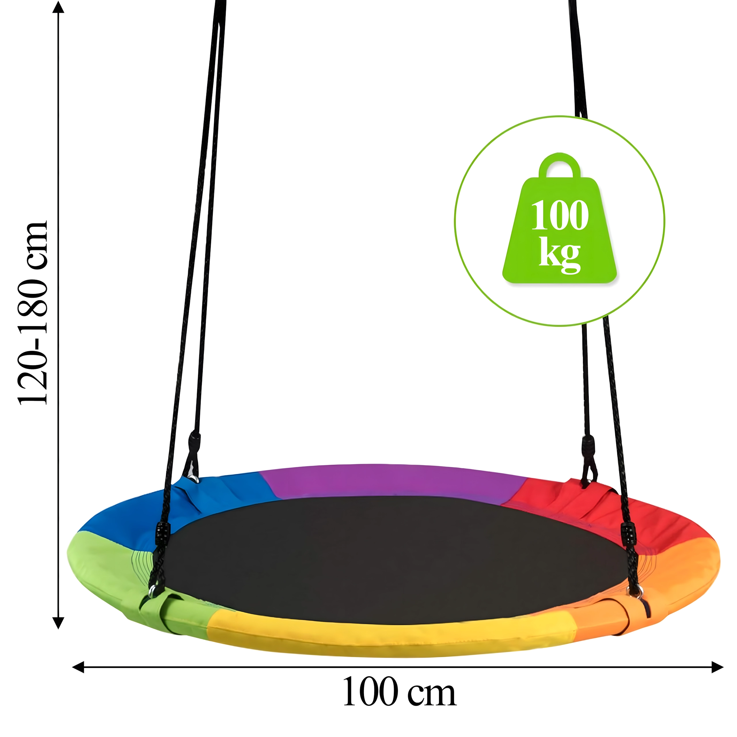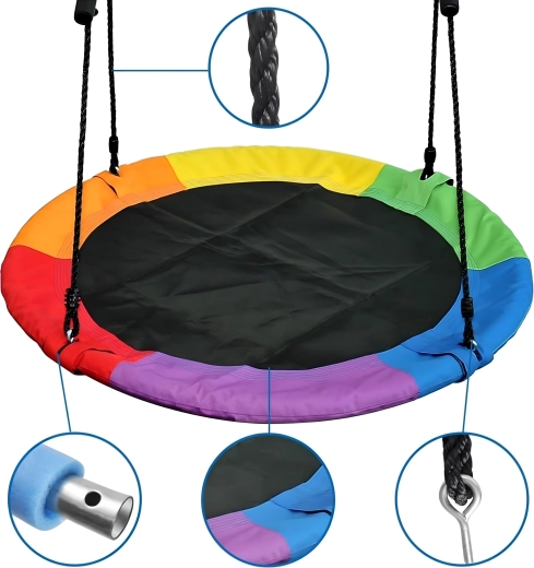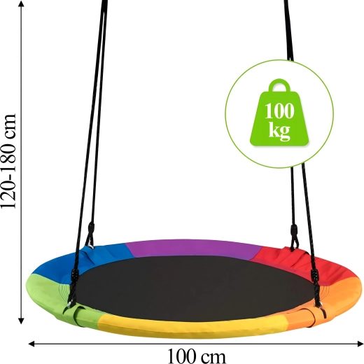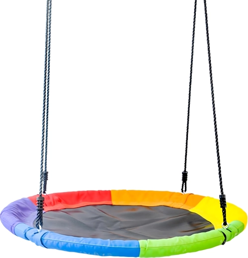 Fedezze fel a stabil és kényelmes, 100 cm átmérőjű gólyafészket, amely kedvenc játszóhellyé varázsolja kertjét. A puha, párnázott perem, a strapabíró ülőfelület és a négypontos felfüggesztés kényelmet és biztonságot nyújt. A hinta kültéri és beltéri használatra egyaránt alkalmas, könnyen telepíthető, és a színes szegélynek köszönhetően remekül mutat.