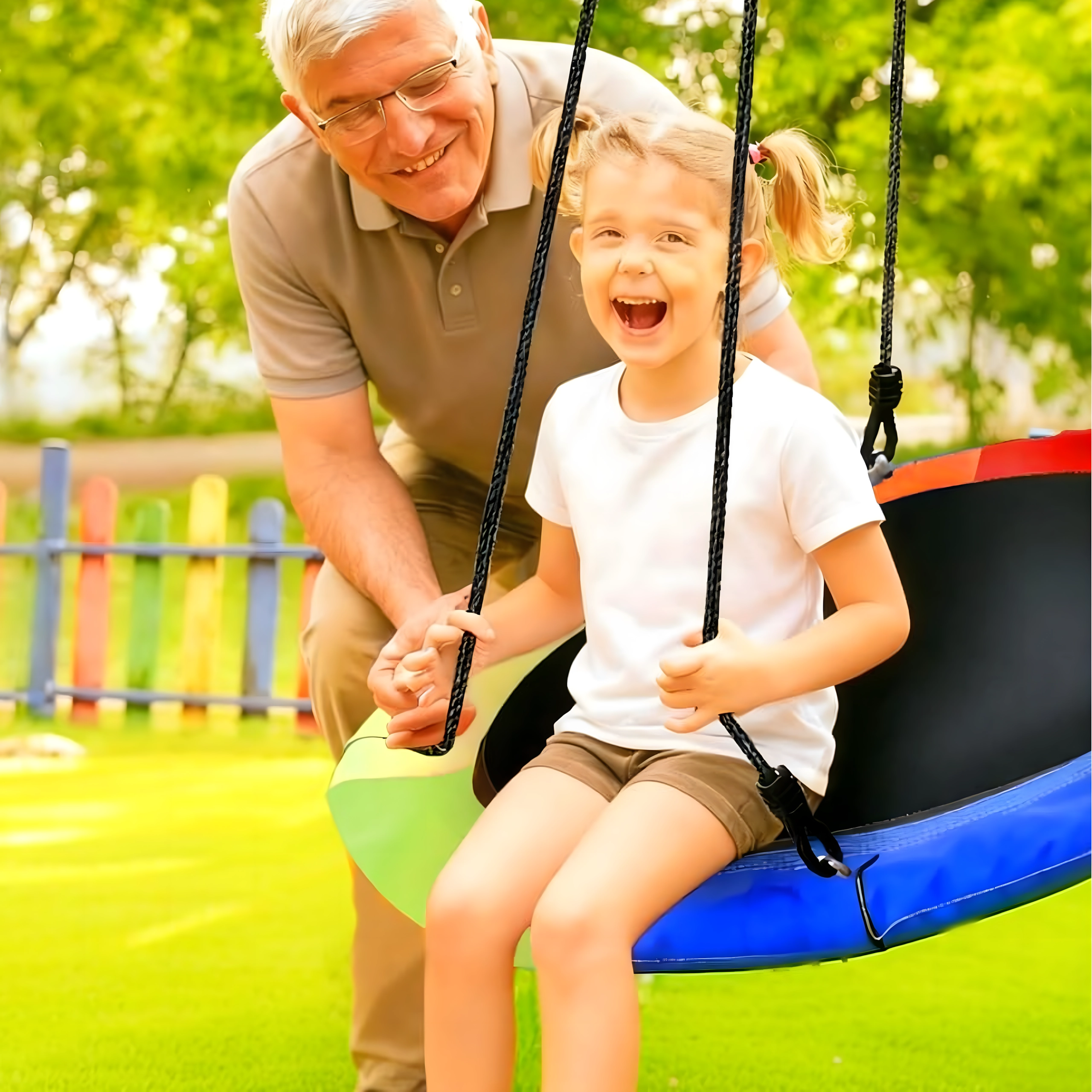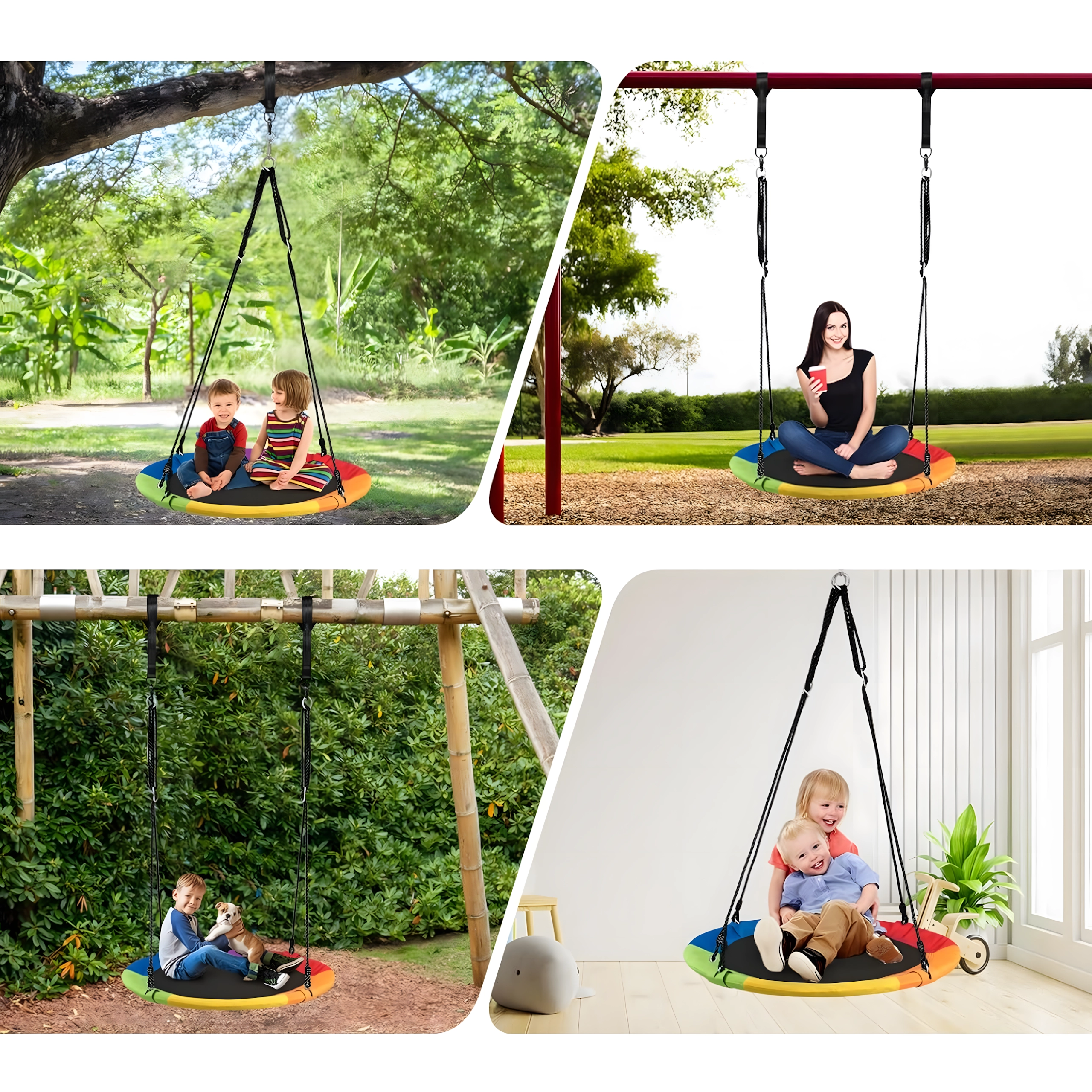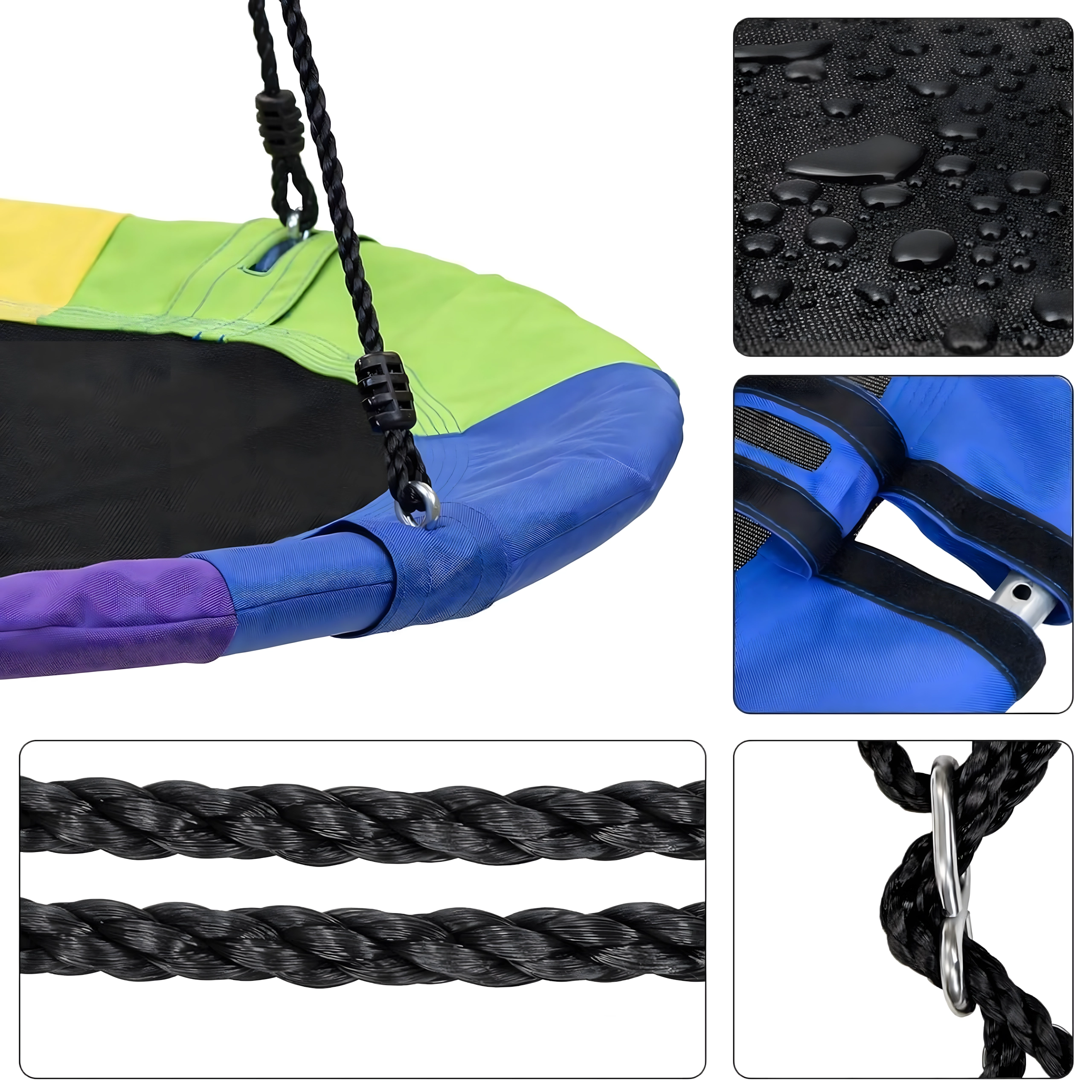Fedezze fel a stabil és kényelmes, 100 cm átmérőjű gólyafészket, amely kedvenc játszóhellyé varázsolja kertjét. A puha, párnázott perem, a strapabíró ülőfelület és a négypontos felfüggesztés kényelmet és biztonságot nyújt. A hinta kültéri és beltéri használatra egyaránt alkalmas, könnyen telepíthető, és a színes szegélynek köszönhetően remekül mutat.
