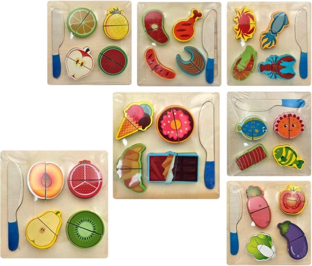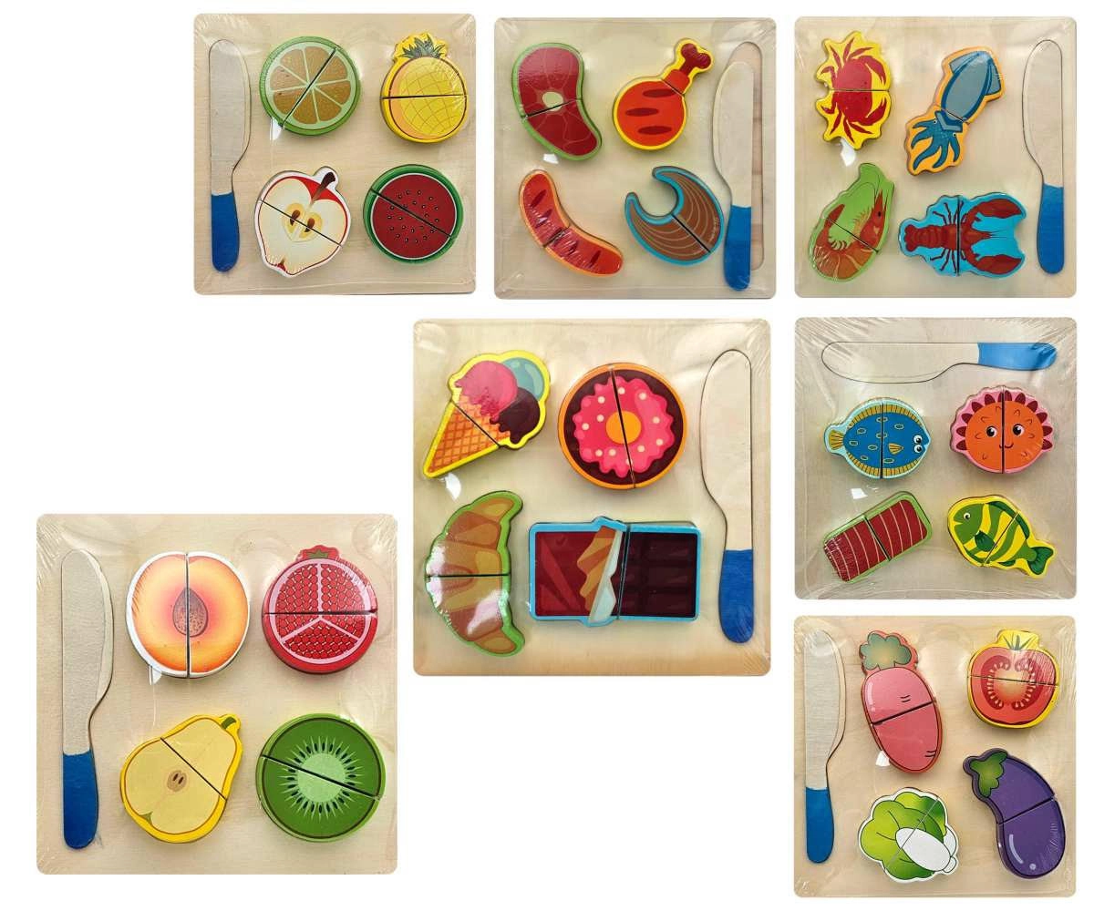 A készlet többféle motívummal kapható, például gyümölcs, zöldség vagy pékáru. Minden darab tartós fából készül, sima élekkel a biztonságos játékért. Az ár egy darabra/változatra vonatkozik – ideális a gyerekek „konyhai” gyűjteményének fokozatos bővítéséhez.