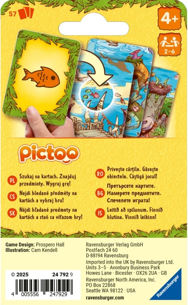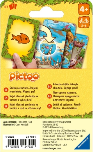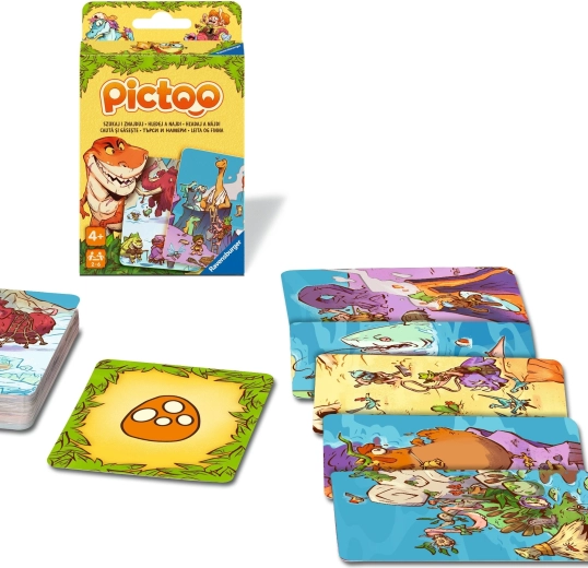 A Ravensburger Pictoo: dinoszauruszok pörgős családi játék, amely próbára teszi a megfigyelőképességet és a gyors döntéshozatalt. Minden körben konkrét képeket kerestek a kártyákon, és aki elsőként szabadul meg tőlük, az nyer. Az egyszerű szabályok és a dinamikus tempó garantálják, hogy gyerekek és felnőttek egyaránt gyorsan bekapcsolódjanak.