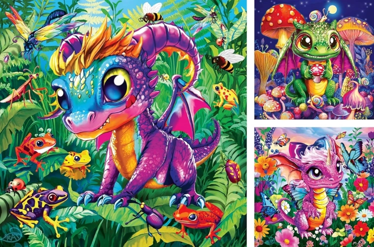 Fedezd fel a kirakózás varázsát a RAVENSBURGER gyermek puzzléval – három, egyenként 49 darabos kép aranyos sárkányfiókákkal a természetben. Minden kirakó mérete kb. 21 × 21 cm, minőségi, erős kartonból a hosszan tartó használatért. Ideális a finommotorika, a türelem és a logikus gondolkodás fejlesztésére. 3 kép egy csomagban, 49 darab képenként, prémium RAVENSBURGER minőség.