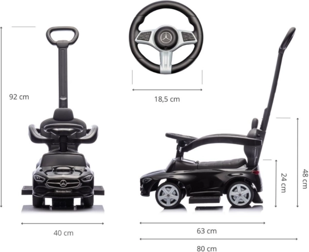 A miniatűr MERCEDES C‑Class lenyűgöz a precíz részleteivel – első hűtőrács, lámpák és emblémák –, így a gyerekek úgy érezhetik, mintha igazi autóban ülnének. A tolóbicikli a kényelmet, a stabilitást és a funkcionalitást ötvözi: a puha ülés támlával, a védőkorlátok és a csúszásgátló lábtartók nyugodt haladást biztosítanak, miközben a szülők a magas vezetőrúd segítségével biztonságosan irányíthatják az útirányt és a tempót.
