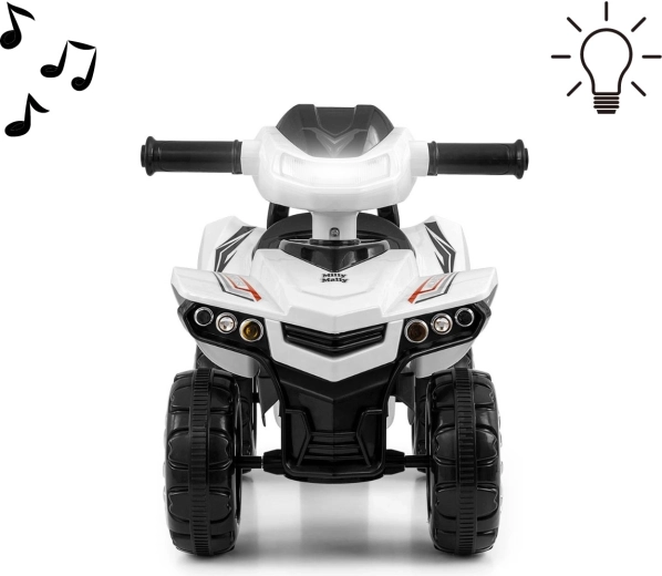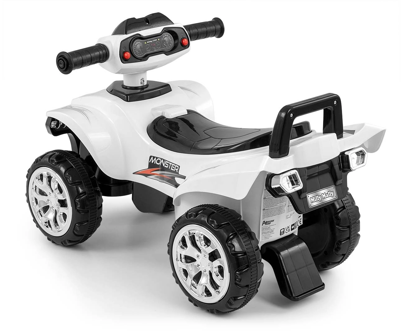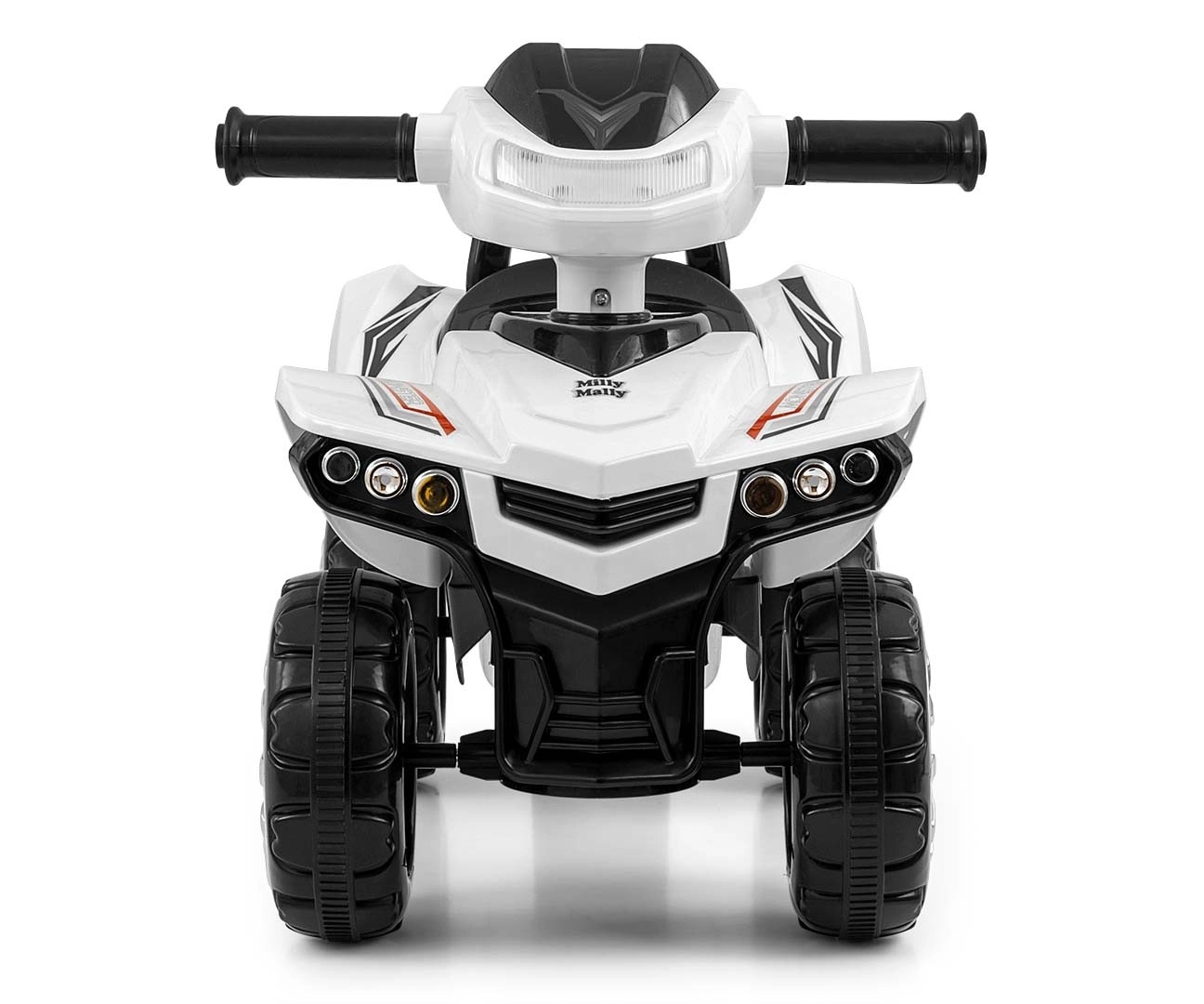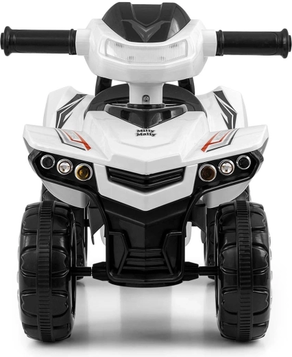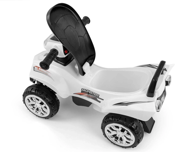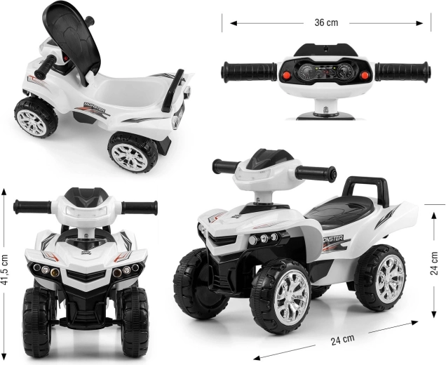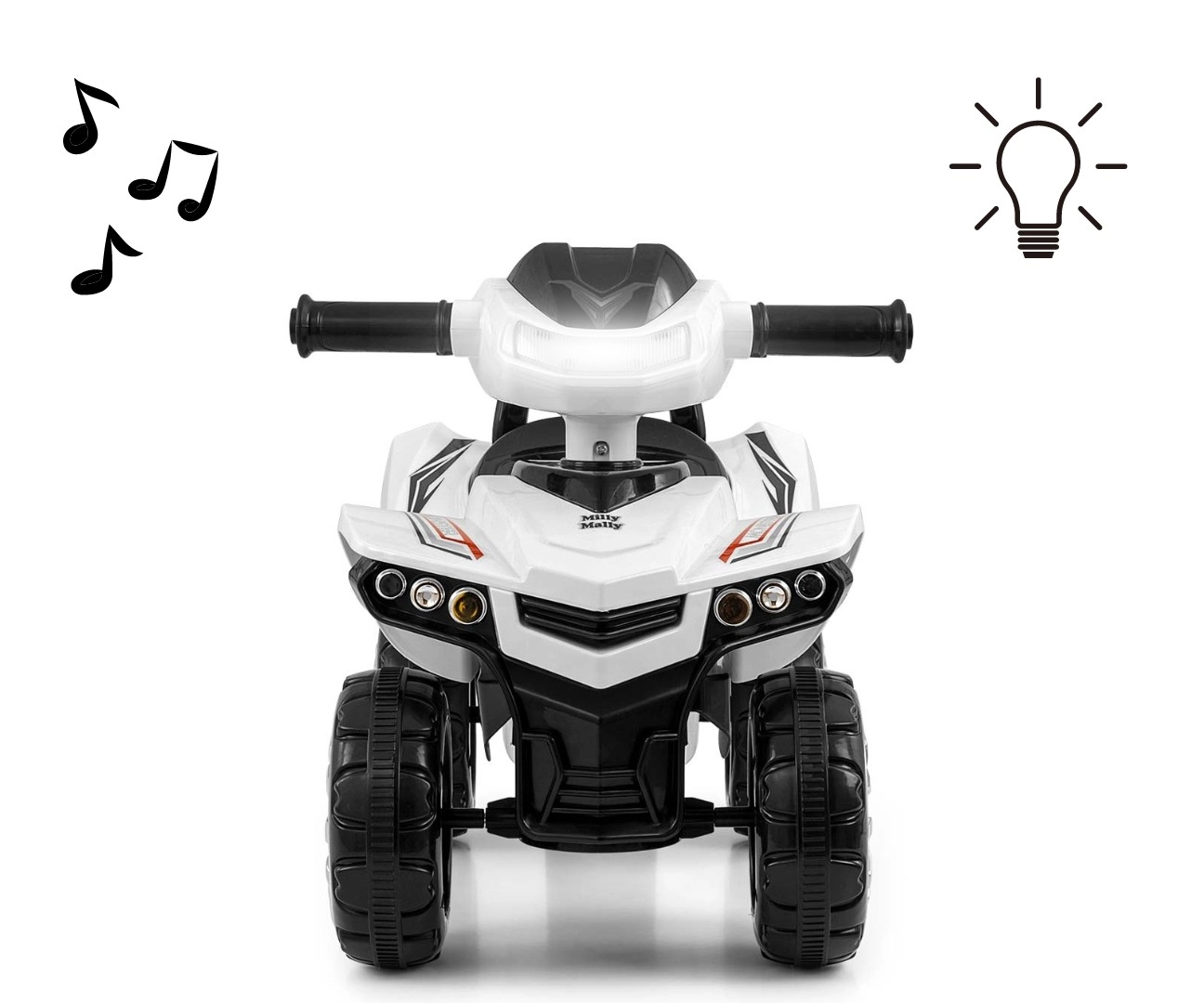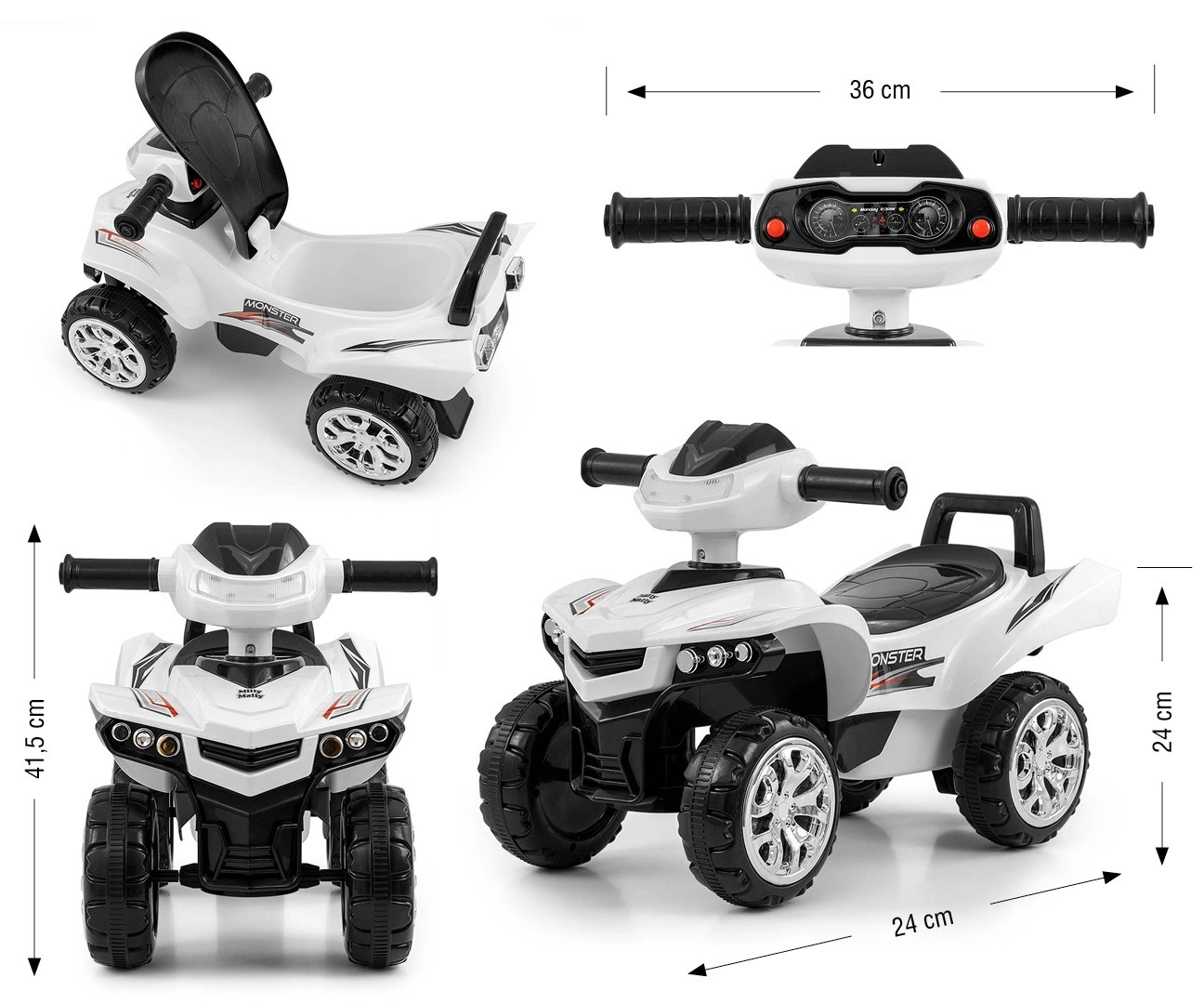 Stílusos gyerek futóbicikli quad formában, otthoni és kültéri használatra. Kínál széles, mintázott kerekeket a stabilitásért, formázott ülést a kényelemért és interaktív kormányt dallamokkal és fényekkel a szórakozásért és a motorika fejlesztéséért. Az ülés alatt praktikus tároló rekesz található apróságoknak.