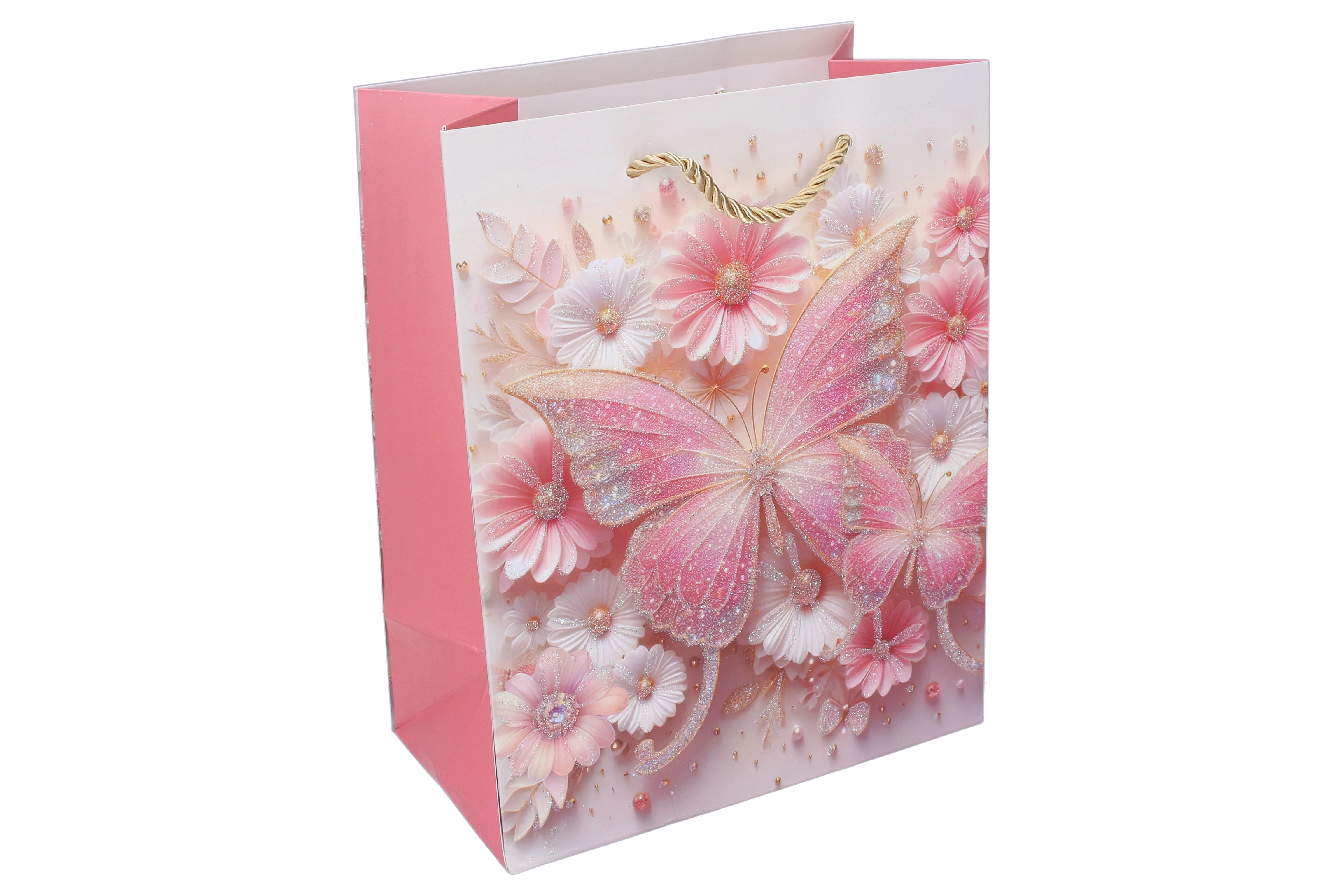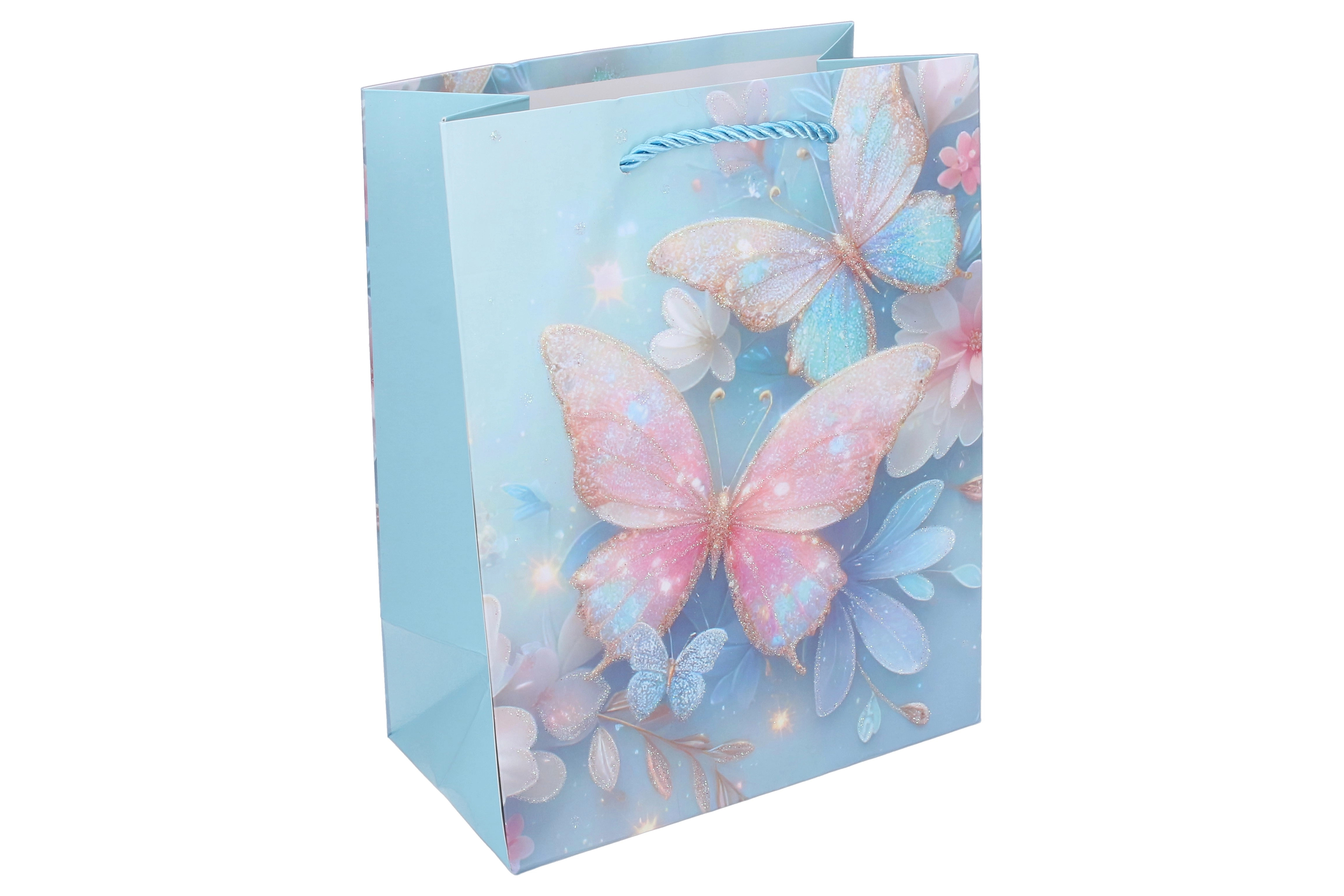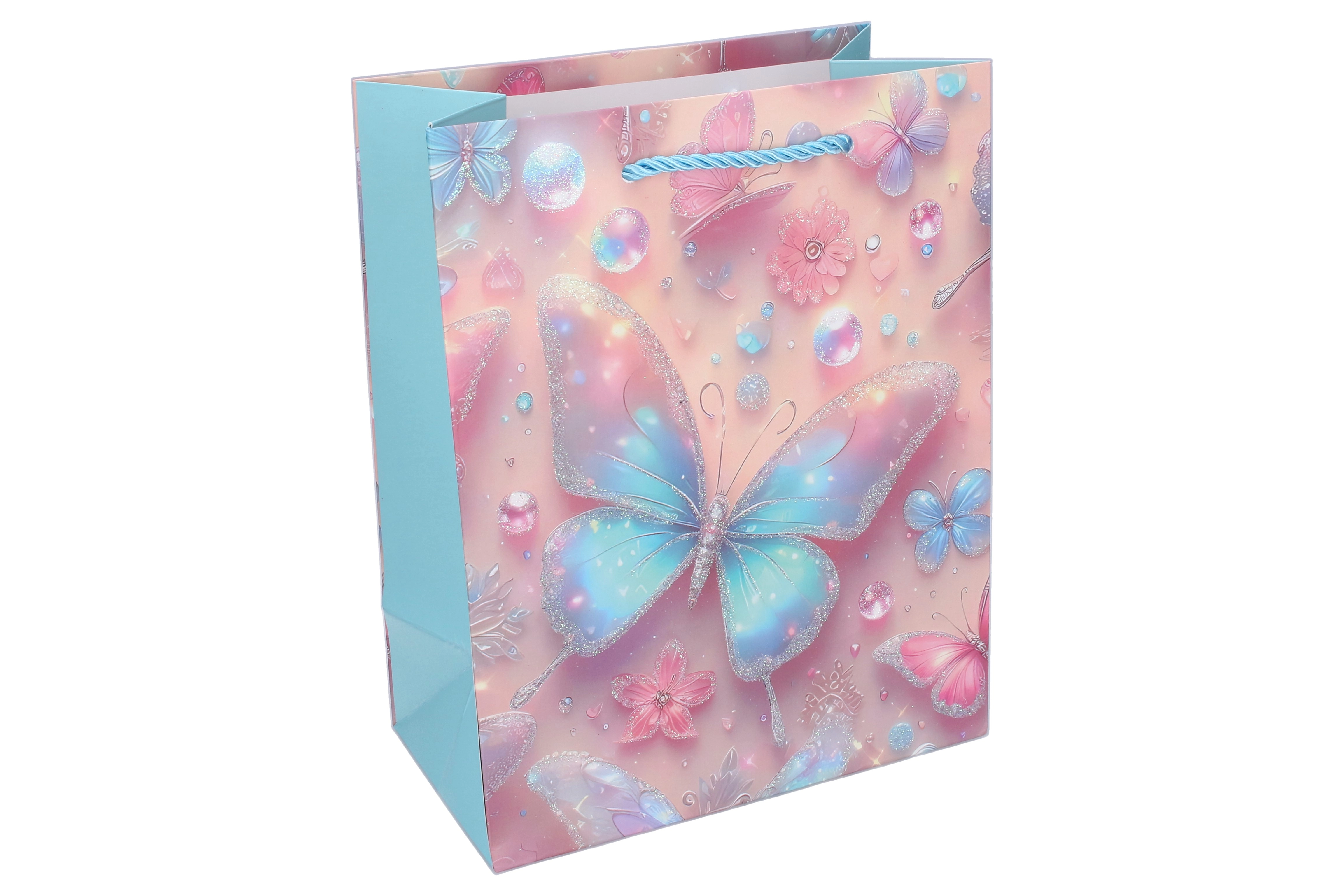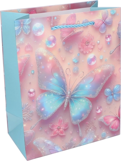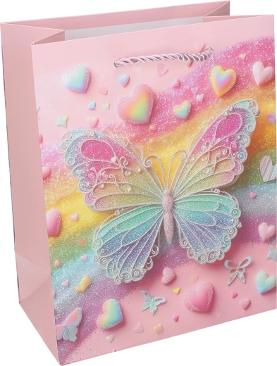 A masszív papírszerkezetnek, a megerősített aljnak és a csavart zsinórfüleknek köszönhetően a táska kényelmes és megbízható hordozást biztosít. A pillangókon lévő fényes és csillogó akcentusok különleges megjelenést adnak, amely a kis ünnepelteket és szüleiket is megörvendezteti.