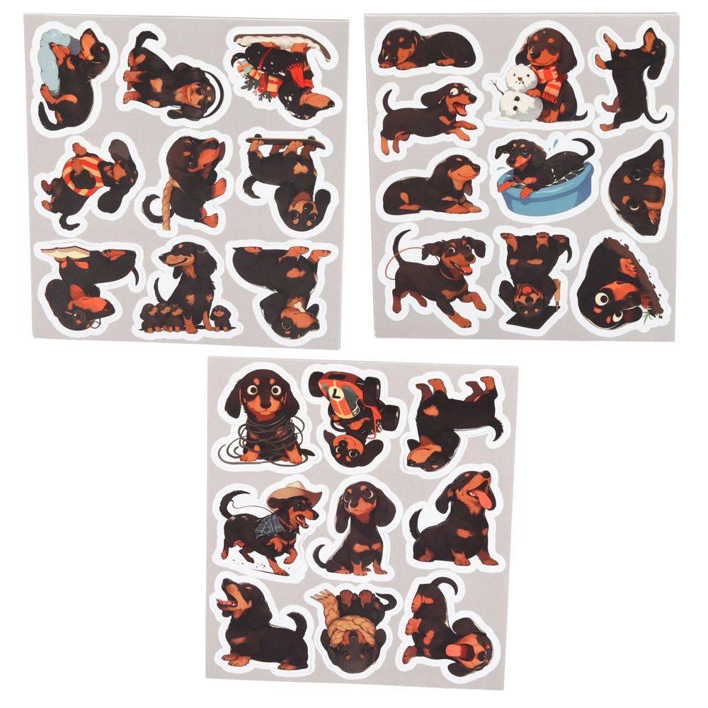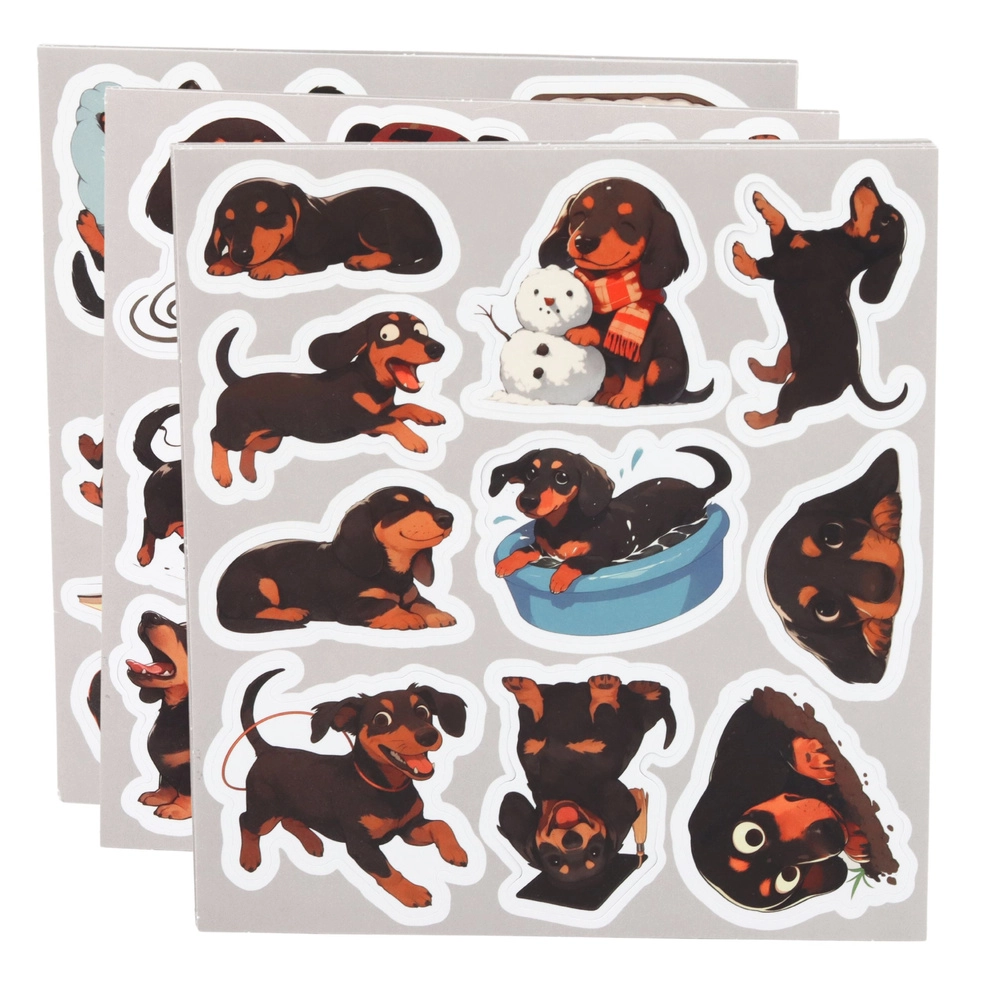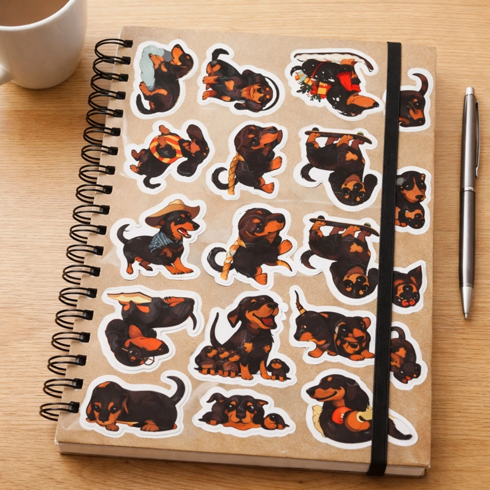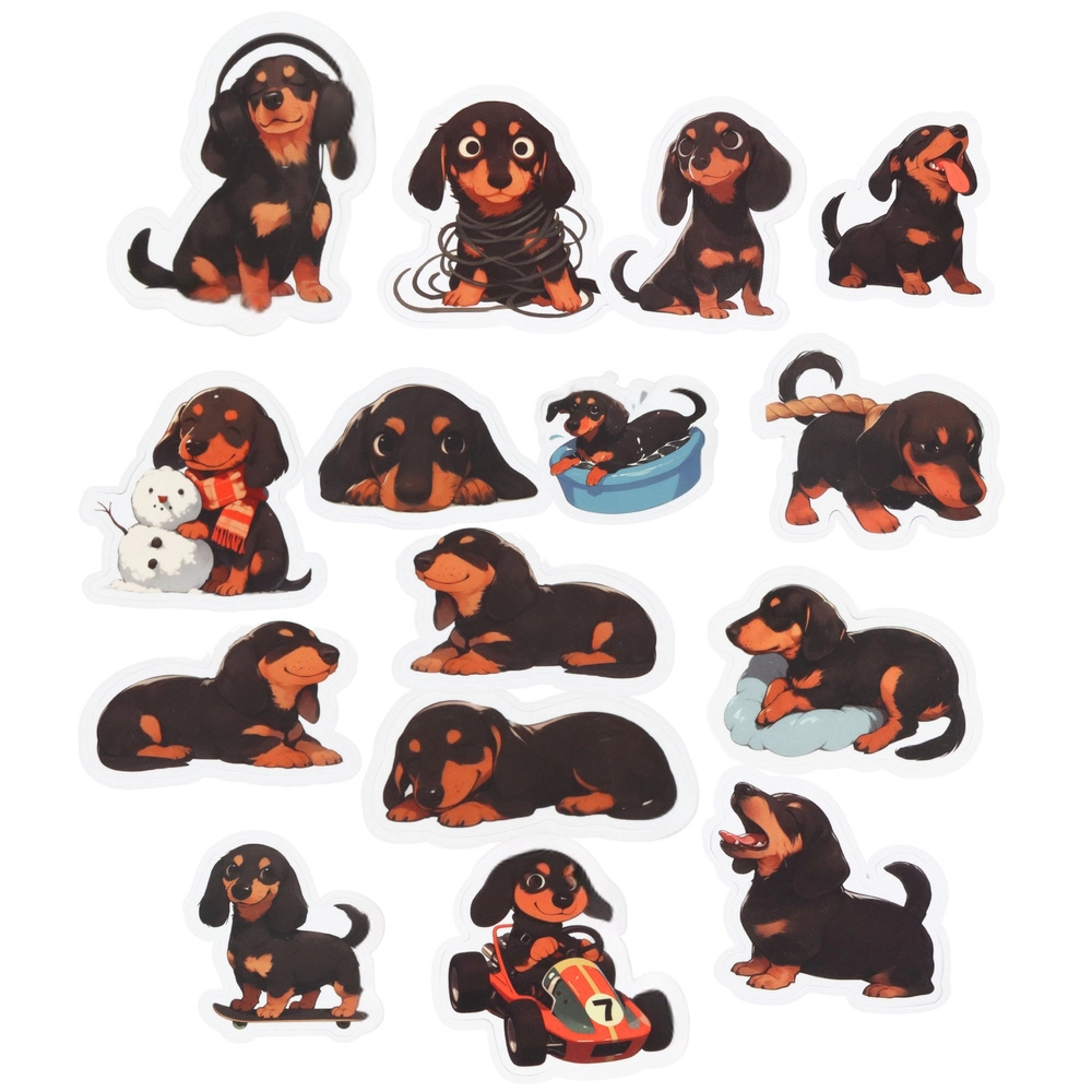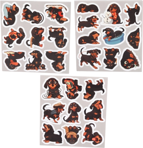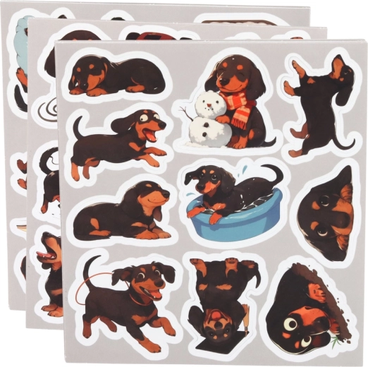 Aranyos tacskó-motívumos matricakészlet, amely 54 különböző dizájnt kínál füzetek, naplók, tervezők vagy ajándékok díszítéséhez. Minden matrica más-más pózban ábrázolja a tacskót, így könnyedén alkothatsz egyedi kompozíciókat. A matricák könnyen lehúzhatók és jól tapadnak, praktikus, kb. 5–6 cm-es méretűek, és remekül tartanak a sima felületeken.