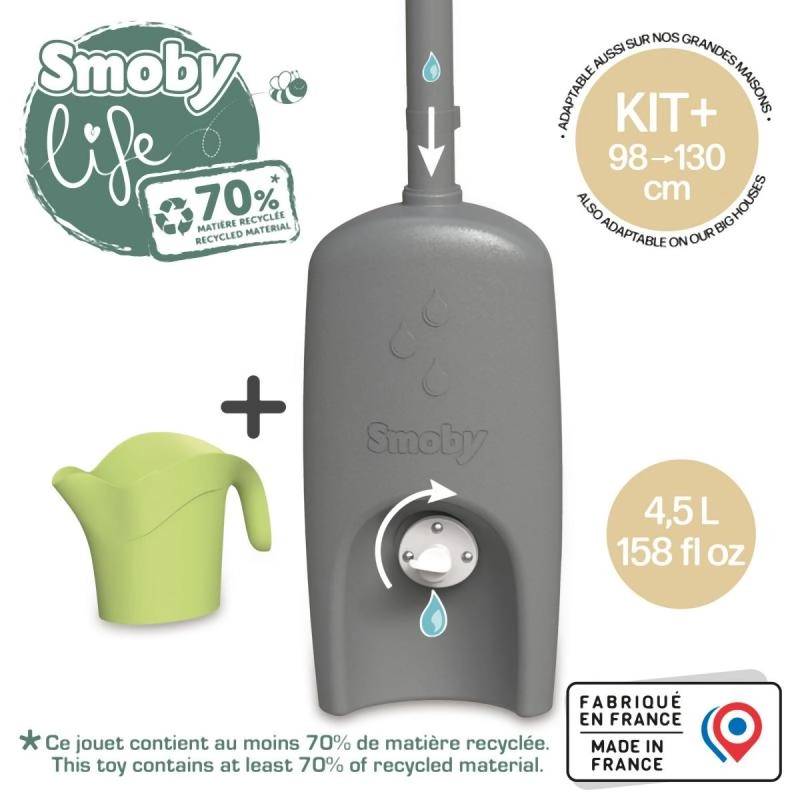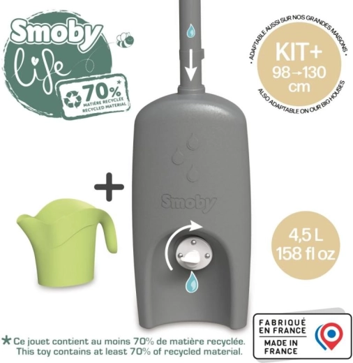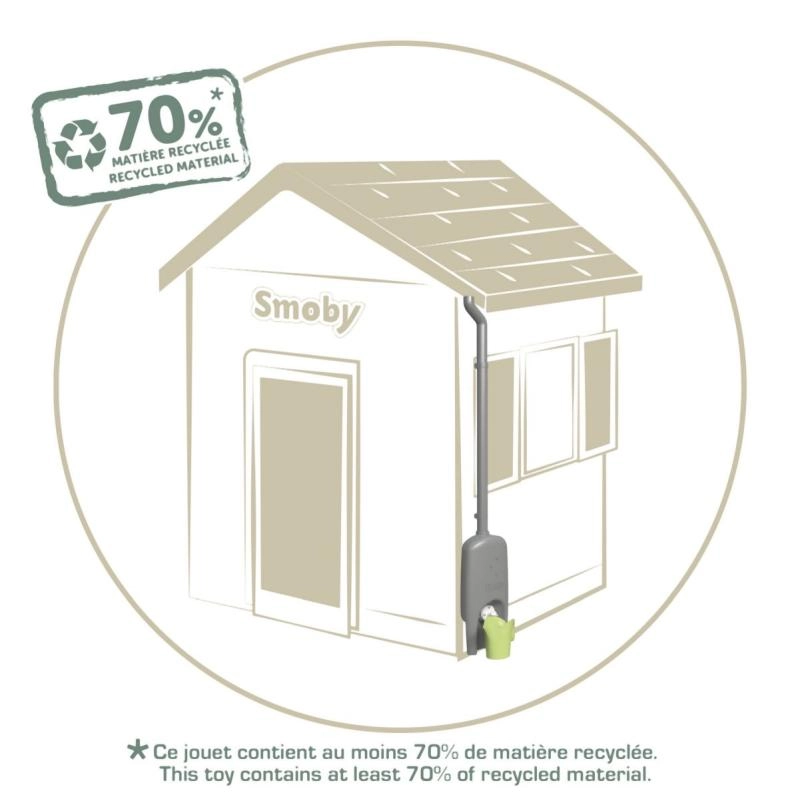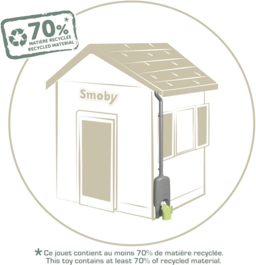 Praktikus kiegészítő a SMOBY gyerek házikóihoz – csatorna esővíz‑tartállyal és locsolókannával. A rendszer a vizet egy 4,5 l‑es tartályba gyűjti, amelyet a gyerekek könnyen felhasználhatnak locsolásra. Az egyszerű felszerelésnek, a nagy csavaros szelepnek és az Anti‑UV védelemnek köszönhetően ez a kiegészítő tartós, biztonságos, és készen áll órákon át tartó szabadtéri játékra és környezeti nevelésre. Legalább 70% újrahasznosított anyagot tartalmaz.