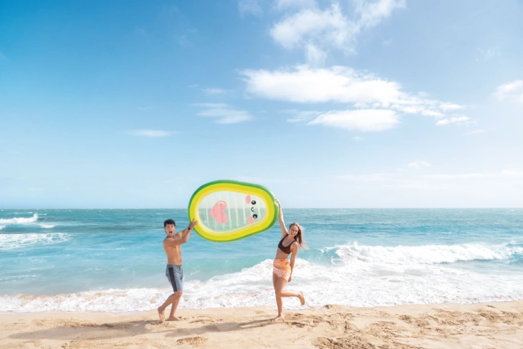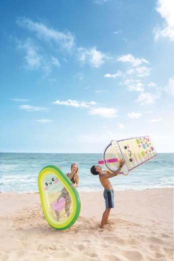 Az Avocado Buddy felfújható matrac friss, avokádó ihlette dizájnt hoz a nyári pihenésedbe. A külső perem különböző zöld árnyalatokból halványabb tónusokba és sárgába olvad, míg az átlátszó közép rész kedves rajzolt arccal és rózsaszín szívvel teszi igazán egyedivé. A tartós, átlátszó PVC ideális vízi mókához, és lehetővé teszi, hogy lásd, mi történik a vízfelszín alatt.