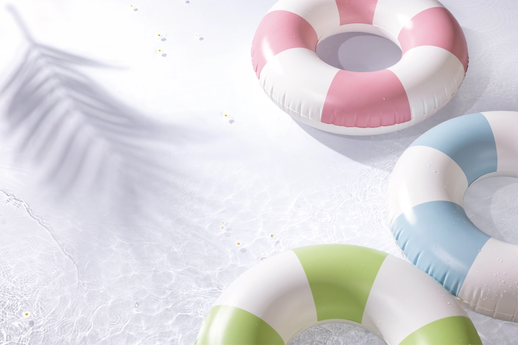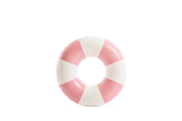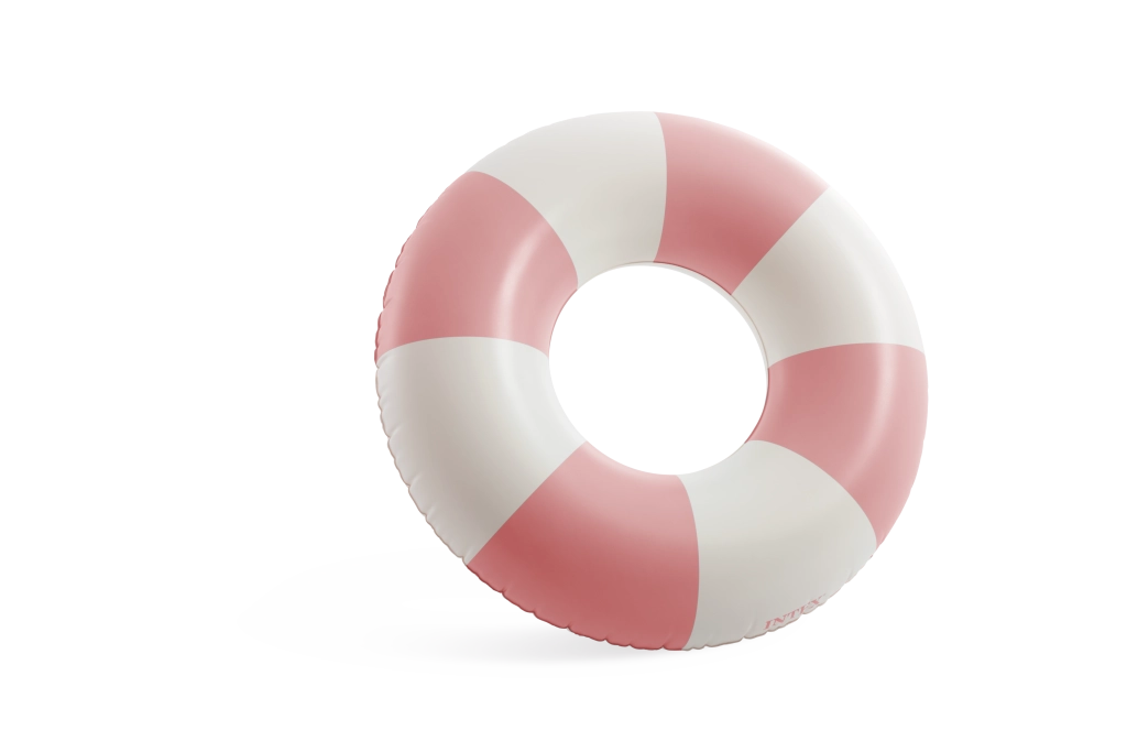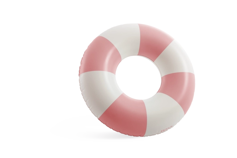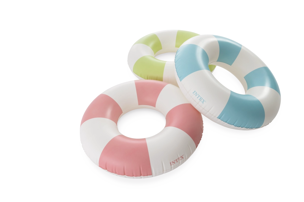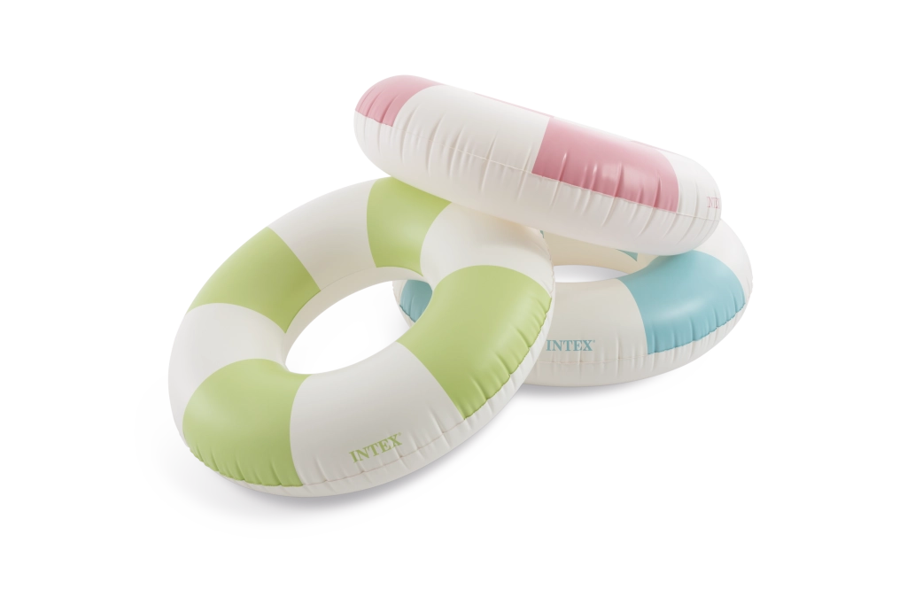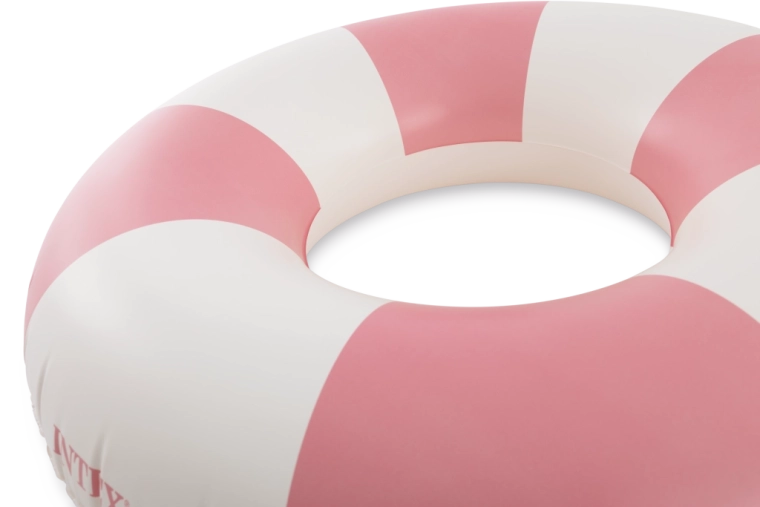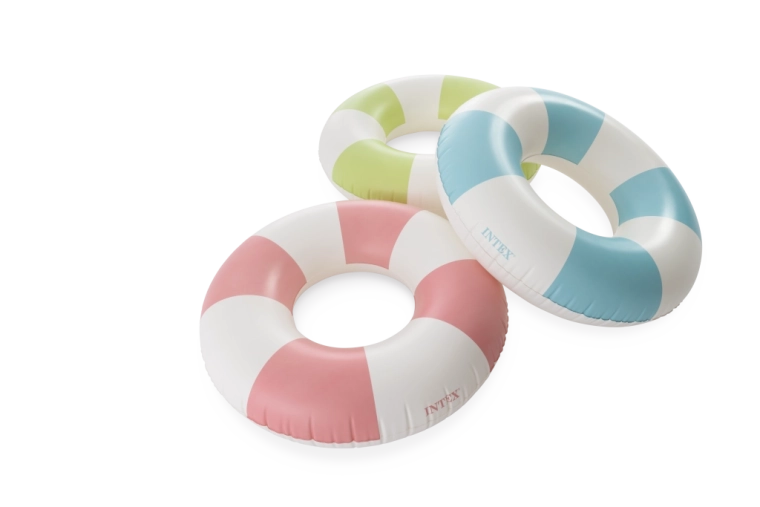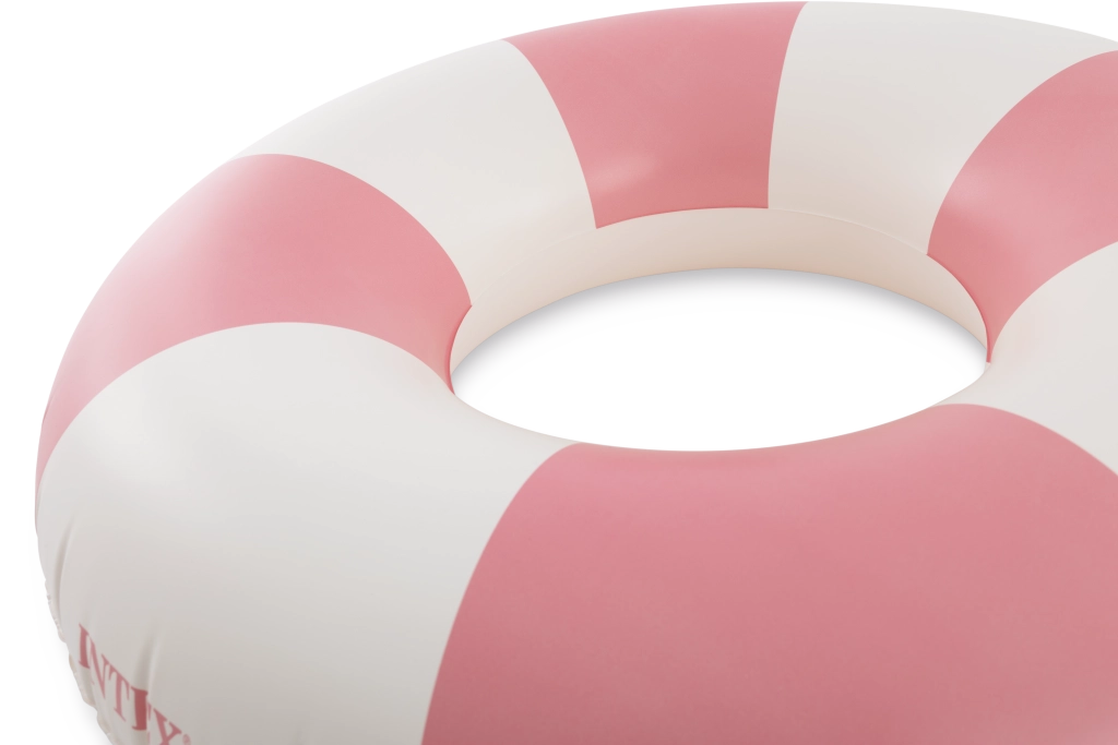 A rózsaszín, kék és zöld trendi kombinációja fehér szegmensekkel nemcsak remekül néz ki, hanem növeli az úszógumi láthatóságát a vízben.