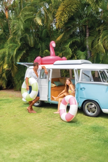 A praktikus szelep lehetővé teszi a gyors felfújást és leeresztést. Az úszógumi könnyű, egyszerűen hordozható és ideális utazáshoz.