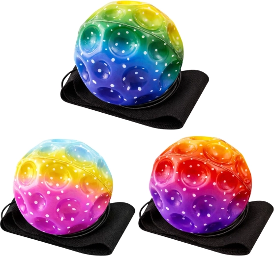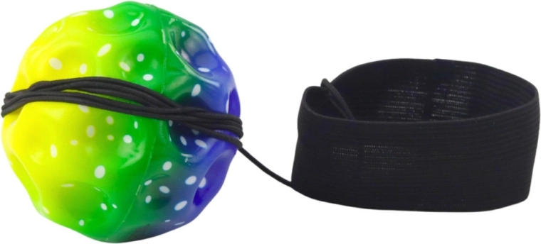 Szenzoros, stresszoldó labda rugalmas zsinórral és csuklópánttal, amely minden dobás vagy ütés után visszatér, így a gyerekeknek nem kell utána futniuk. A szivárványos színek mozgásra ösztönöznek, a gödröcskés struktúra kellemesen masszírozza az ujjakat, támogatja a finommotorikát és a koncentrációt.