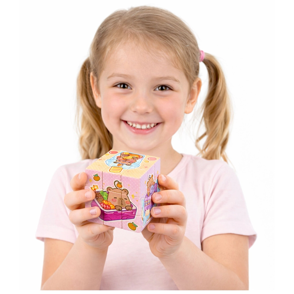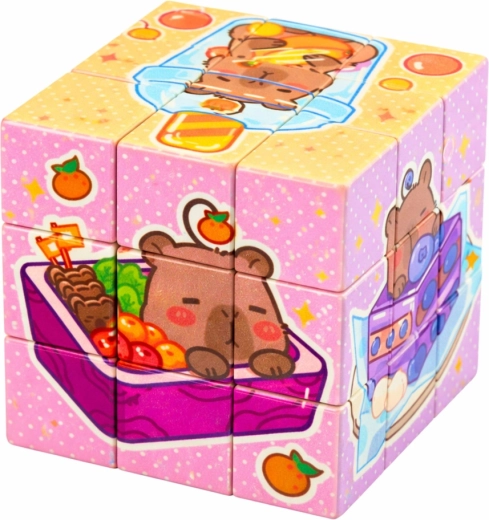 Ez a színes logikai kocka kapibara motívummal remek első fejtörő játék a legkisebbeknek. A gyerekek a szegmensek forgatásával és illesztésével minden oldalon aranyos képeket raknak ki, így természetes módon fejlesztik megfigyelőképességüket és türelmüket. A sima felületeknek és a kellemes méretnek köszönhetően a kocka könnyen kézben tartható, és újra meg újra játékra hív.