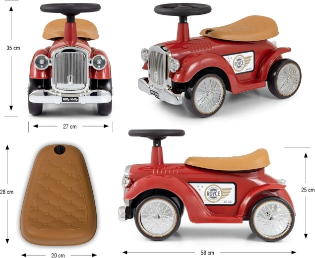 Stílusos gyerek futóbicikli, a ROYCE Milly Mally márkától burgundi színben, retro dizájnnal, stabil szerkezettel és kényelmes üléssel. Kormány dudával, puha EVA kerekek és ülés alatti tároló a játékoknak. Kiváló a egyensúly és a motorika fejlesztésére otthon és kint is.