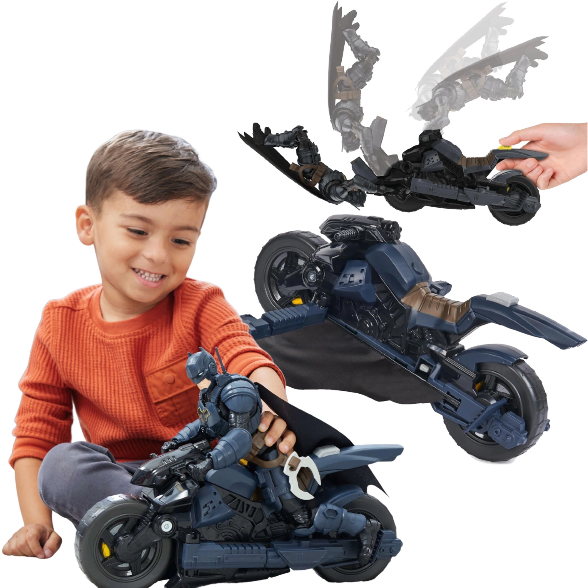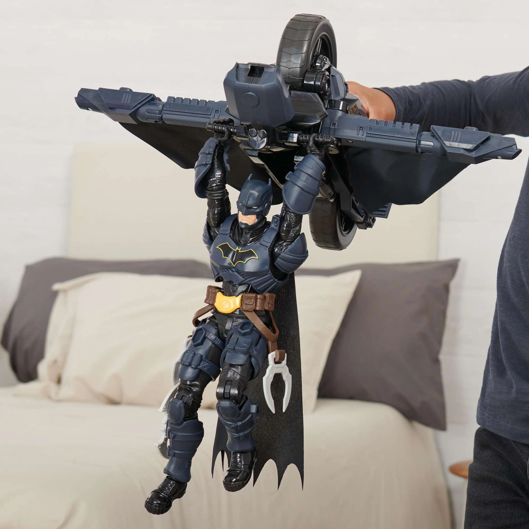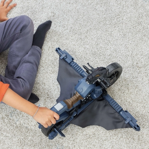 A Batcycle autentikus szuperhős-élményt nyújt a gyerekeknek. A motor stabil üléspozíciót és biztos rögzítést kínál a kormánynál, így a „vezetés” és a „repülés” is sima és magabiztos. Az ülés mögötti gomb megnyomására a jármű szárnyas gliderré alakul, ami kiszélesíti a játéklehetőségeket az üldözésektől a merész leszállásokig.