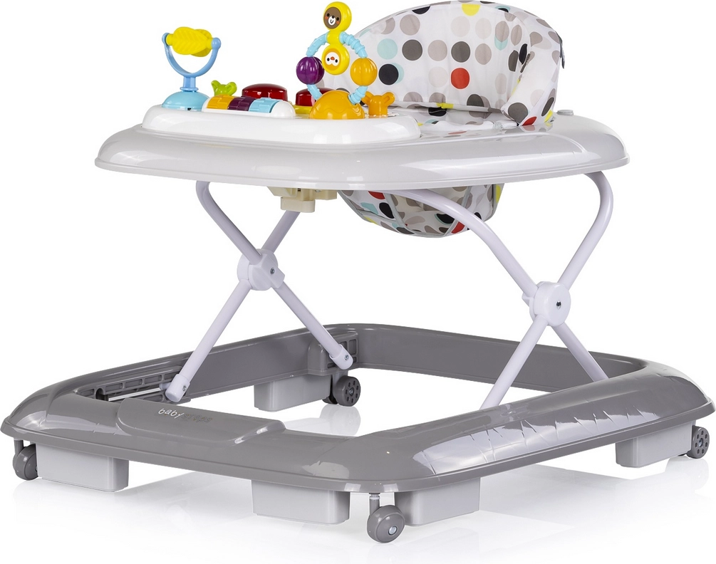 A CHIPOLINO Baby Steps Grey interaktív járássegítő nagyszerű társ a baba első lépéseihez. 3 fokozatban állítható magasságot, puha ülést magas háttámlával és szórakoztató panelt dallamokkal és fényekkel kínál az érzékszervek és a finommotorika fejlesztéséhez. A stabil szerkezetnek, a 6 csúszásgátló ütközőnek és a forgó kerekeknek köszönhetően biztonságos és egyenletes haladást biztosít a járás tanulása közben.