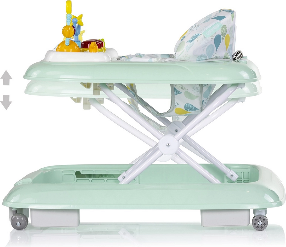 A Baby Steps járássegítő elegáns menta színben egyesíti a játékot, a tanulást és a mozgást. Az interaktív panel színes játékai, fényei és gombjai új ingereket kínálnak, fejlesztik a finommotorikát, miközben a gyermek magabiztosságot szerez az első lépések gyakorlásakor. A három magassági szint lehetővé teszi a járássegítő aktuális testmagassághoz való igazítását az ergonomikus és kényelmes használatért.