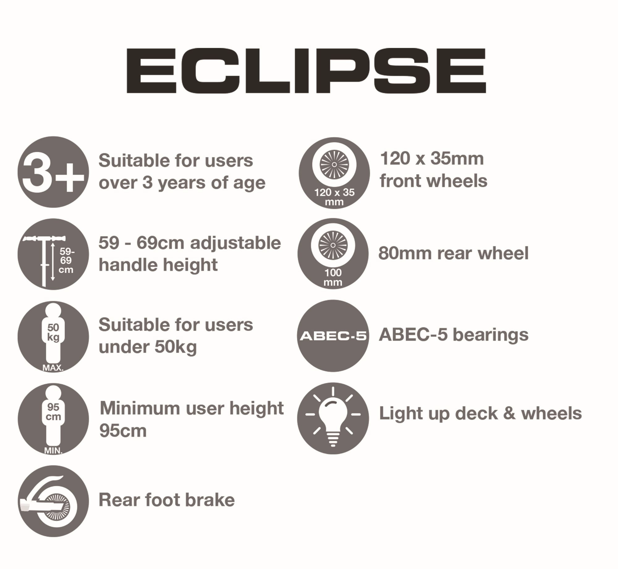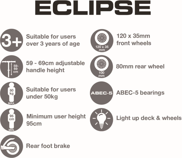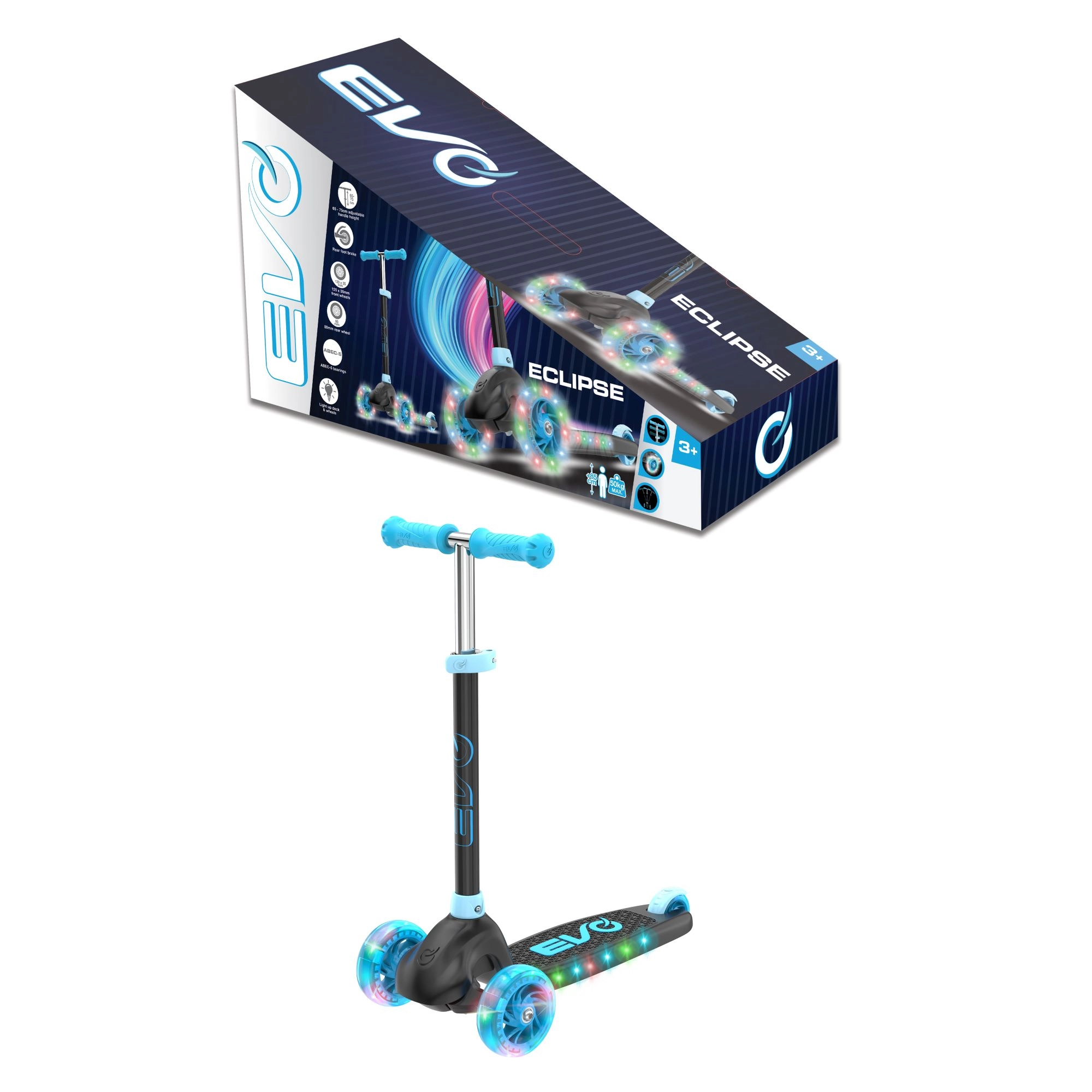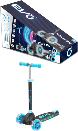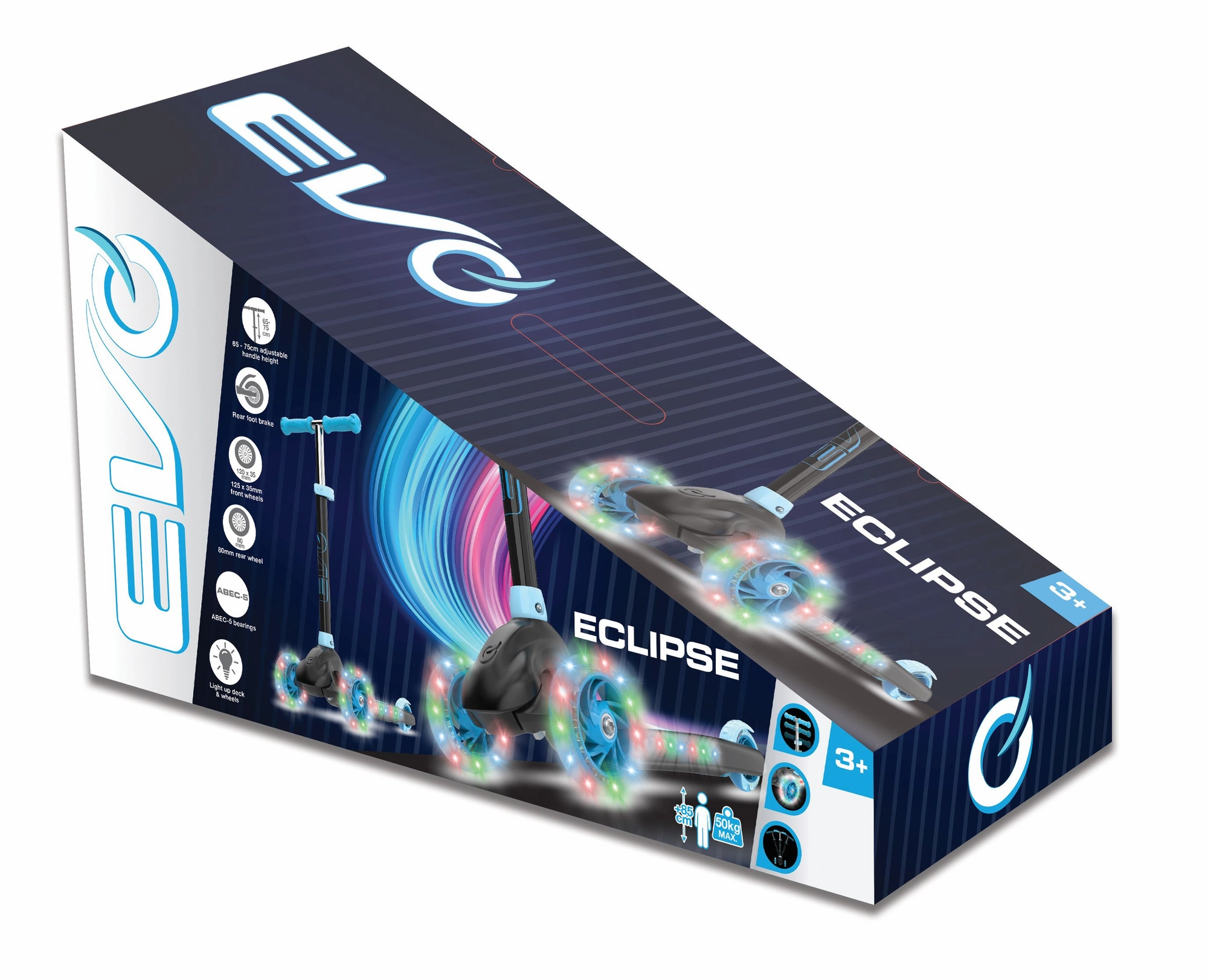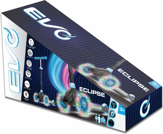 Az EVO Eclipse roller az első lépésekhez készült – a három kerék magas fokú stabilitást nyújt, míg a könnyű konstrukció és a hátsó kerék fölötti lábfék magabiztos megállást biztosít. A LED megvilágítás a kerekeken és a platformon minden utat látványos fényshow-vá varázsol, és javítja a láthatóságot szürkületben.