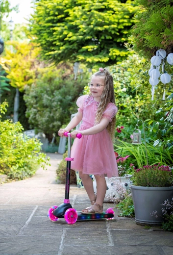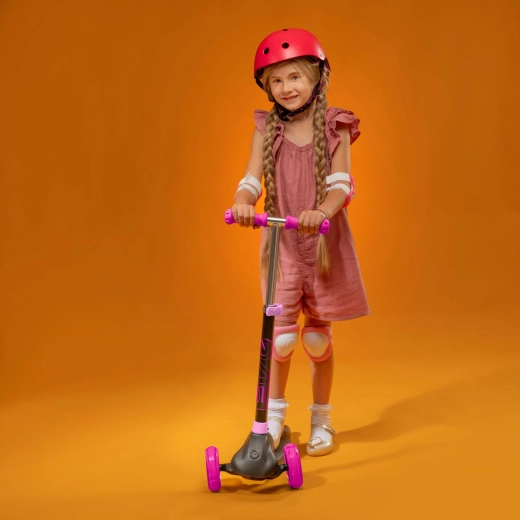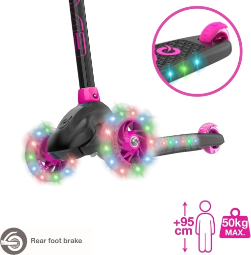 A növekvő kialakítás állítható kormánnyal könnyen igazodik a gyermek magasságához. A puha TPR markolatok kényelmes, biztos fogást adnak, a hátsó keréken lévő sárvédős lábfék pedig gyors és biztonságos megállást tesz lehetővé. Az ABEC-5 csapágyak simább és csendes haladást biztosítanak sík felületeken.