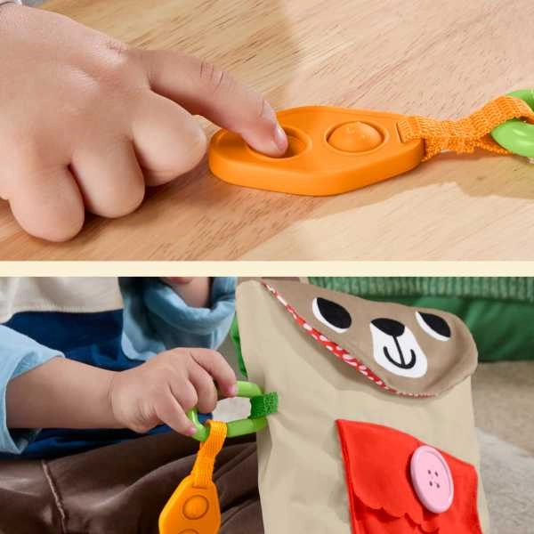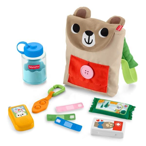 Ez a vidám készlet a Fisher‑Price-tól minden kiruccanást kalanddá varázsol. A puha mackó‑hátizsák gombos zsebbel, klipszel és fülecskékkel okos kiegészítőket rejt: „kulacsot”, gyerek „adóvevőt/telefont”, tépőzáras textil sebtapaszokat, nasit és további elemeket, amelyek nyomásra, nyitásra és csatolásra ösztönöznek. A gyerekek gyakorolják a kéz‑szem koordinációt, a fogást és az ügyességet, miközben kempingezős és gondoskodós szerepjátékot játszanak.