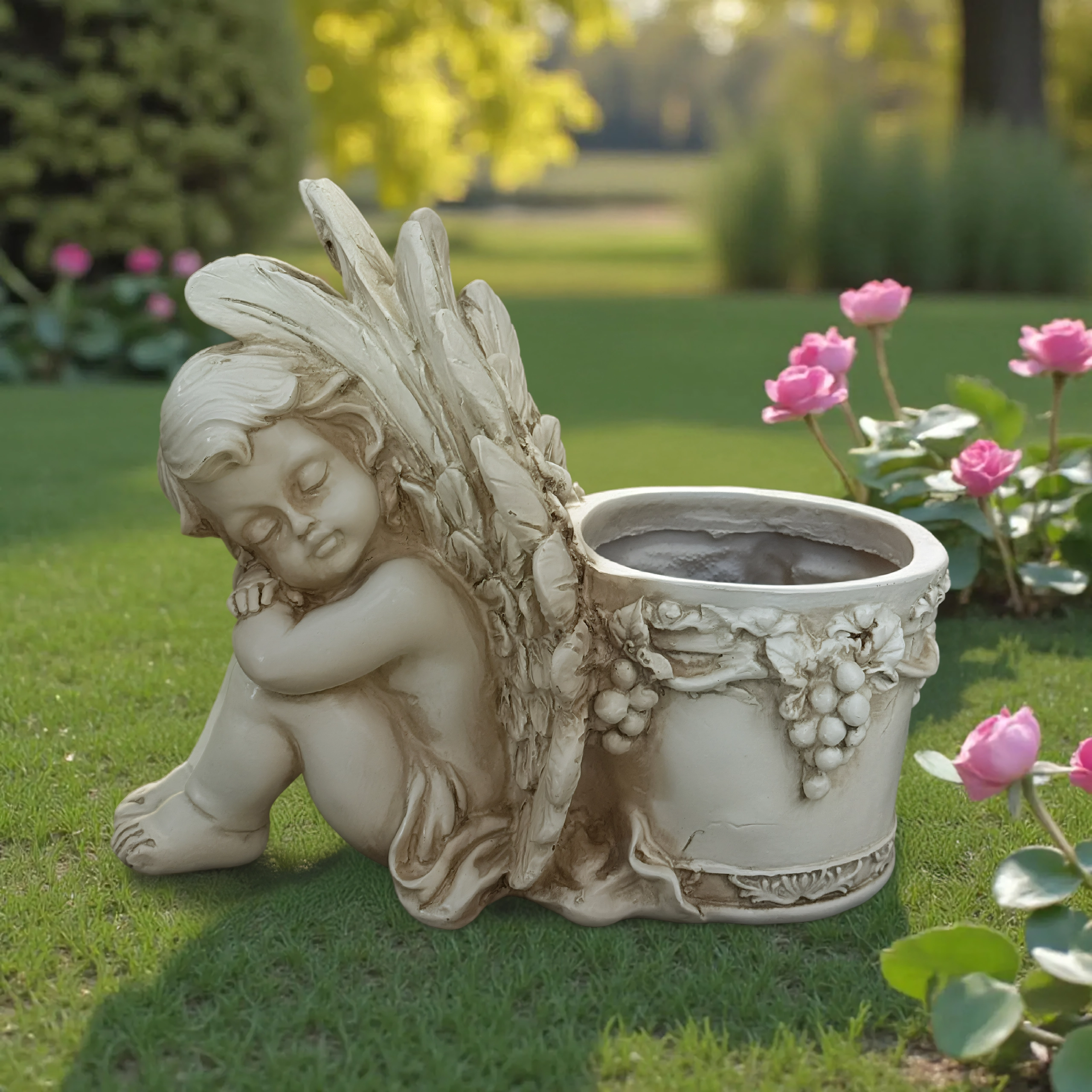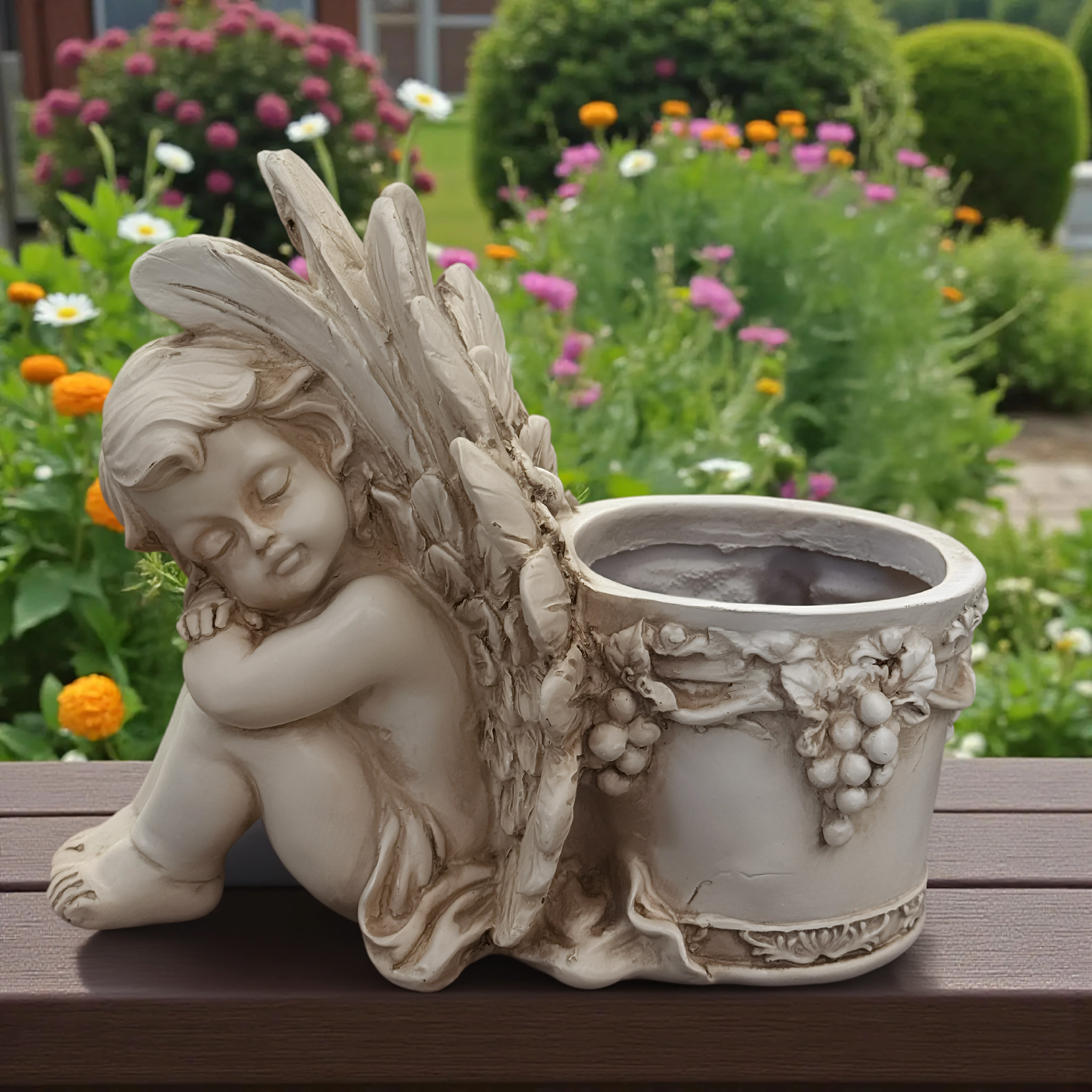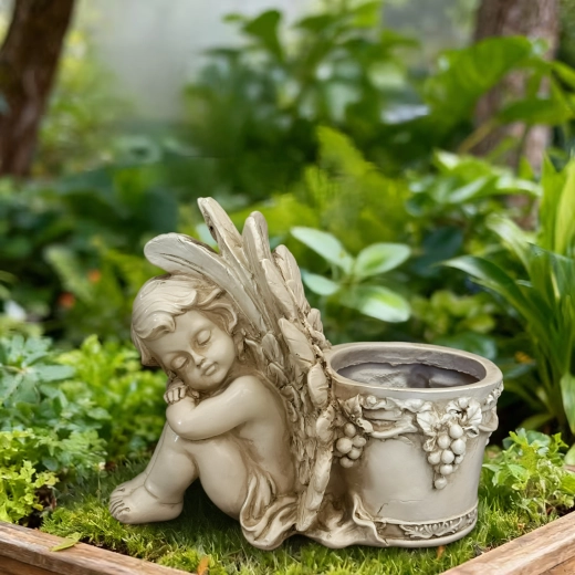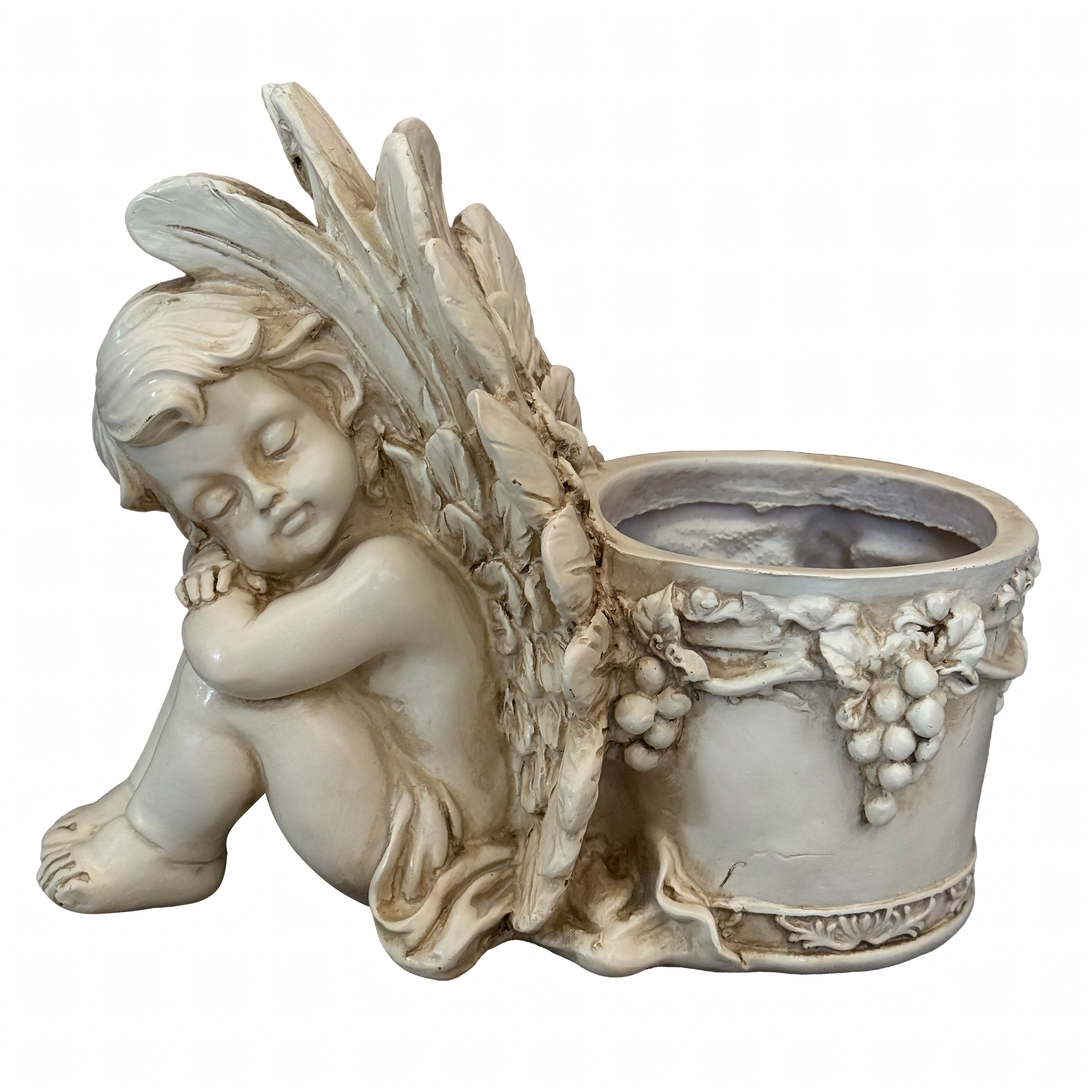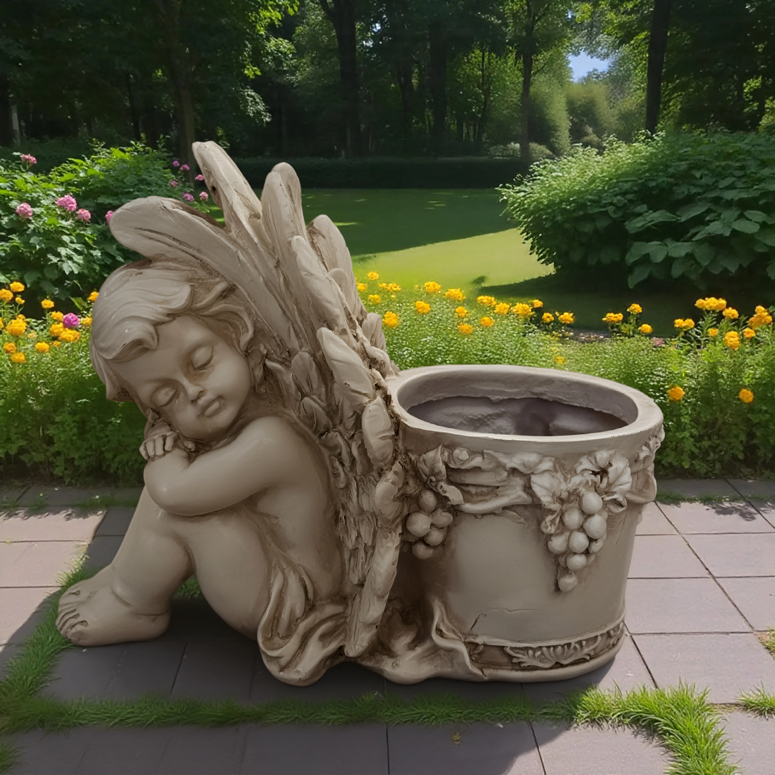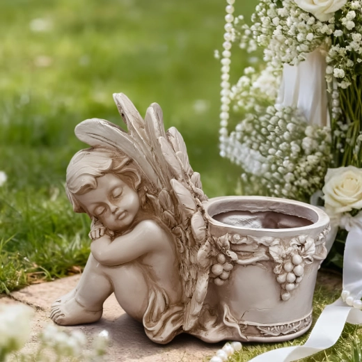 Elegáns, díszes virágtartó alvó angyal motívummal, amely a kertben és otthon is remekül mutat. Részletgazdag domborműves kidolgozás, vintage kőhatás és praktikus hely növényeknek vagy gyertyának. Ideális romantikus kerti dekorációként, fűszernövényekhez és pozsgásokhoz, valamint ajándék-összeállításokhoz.