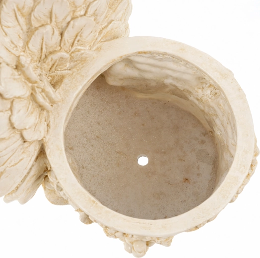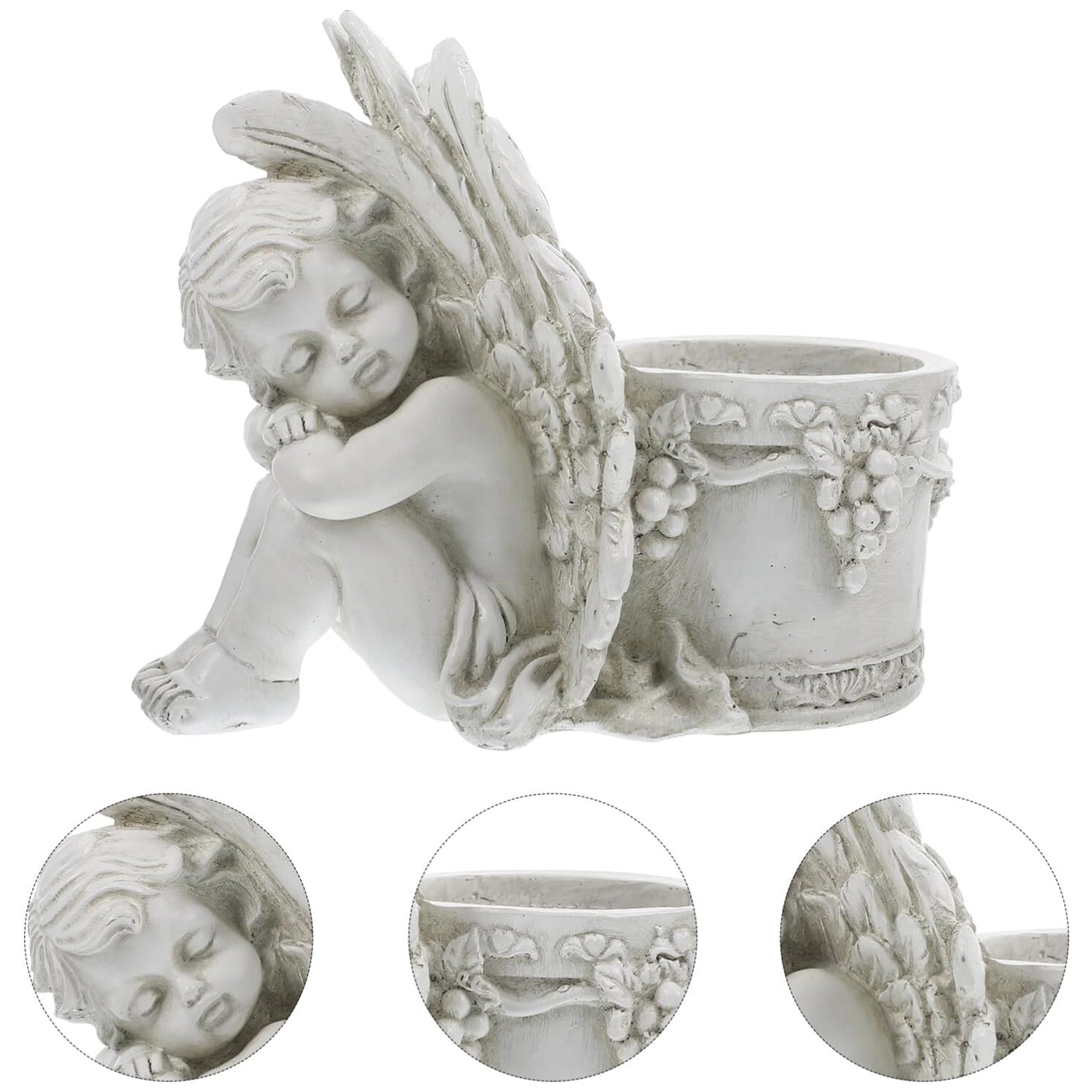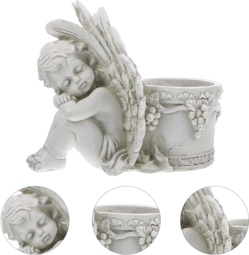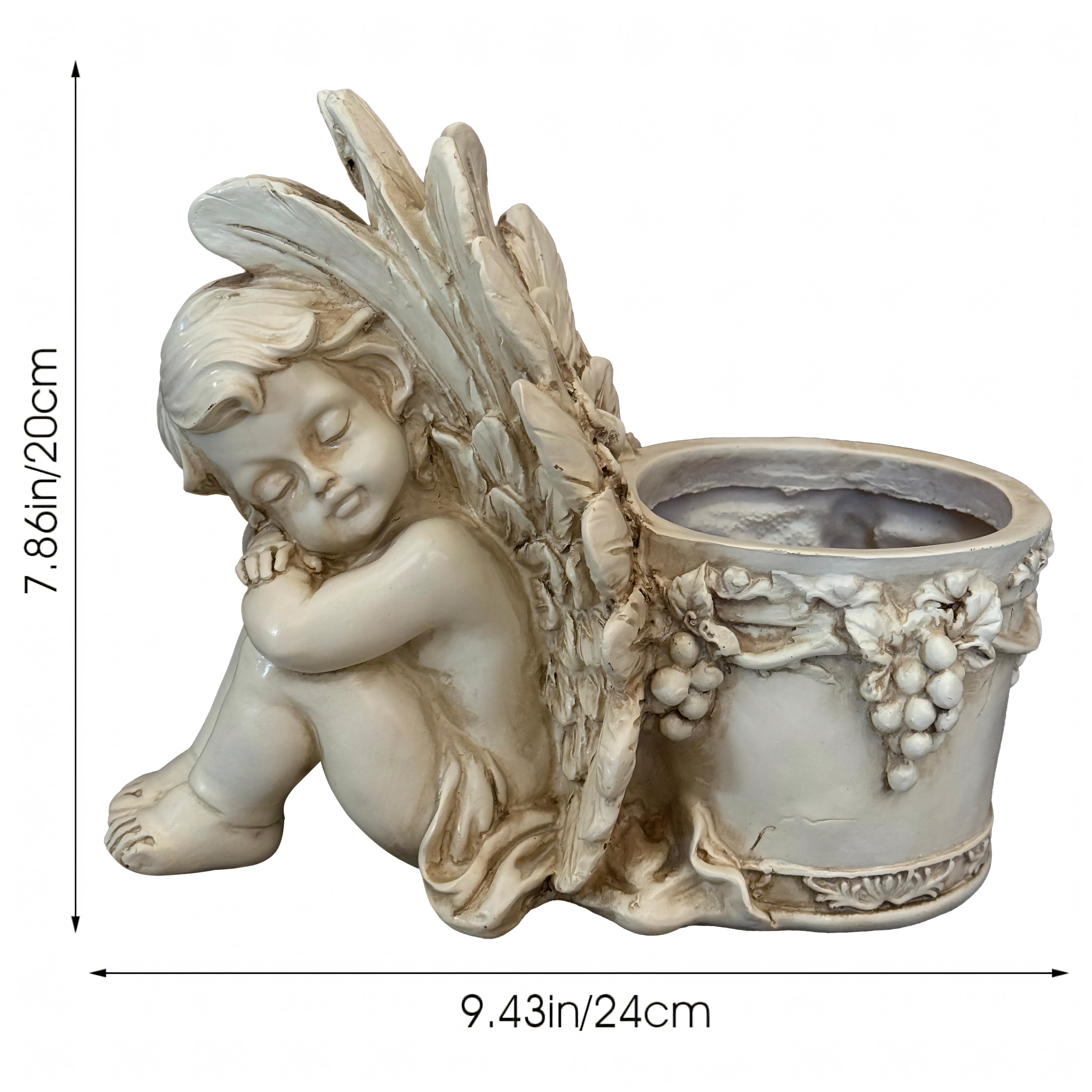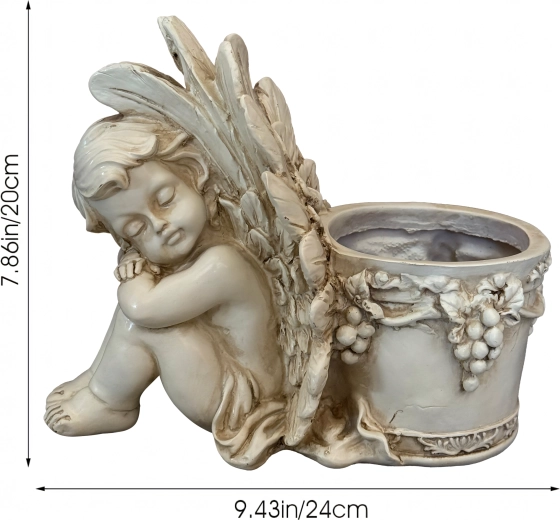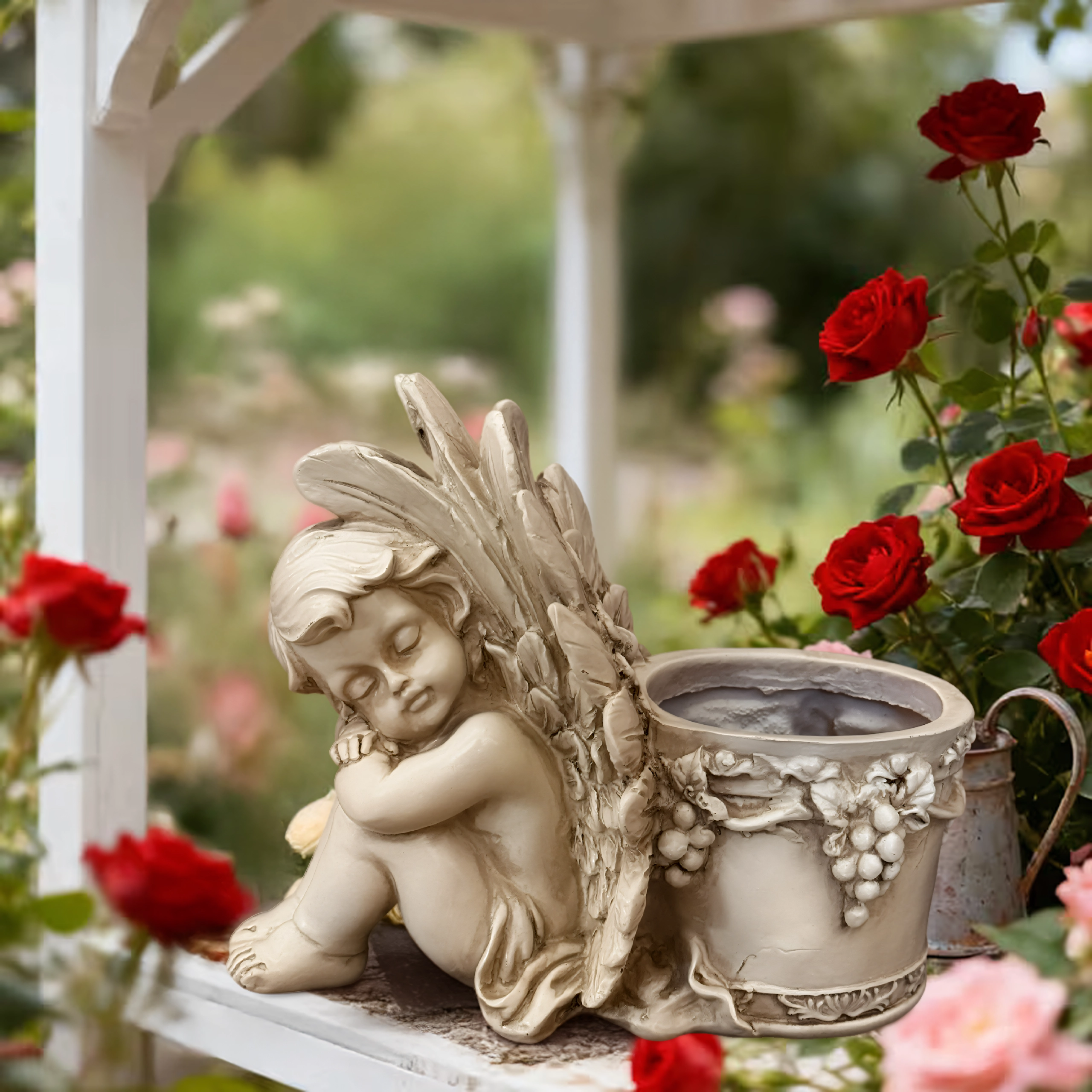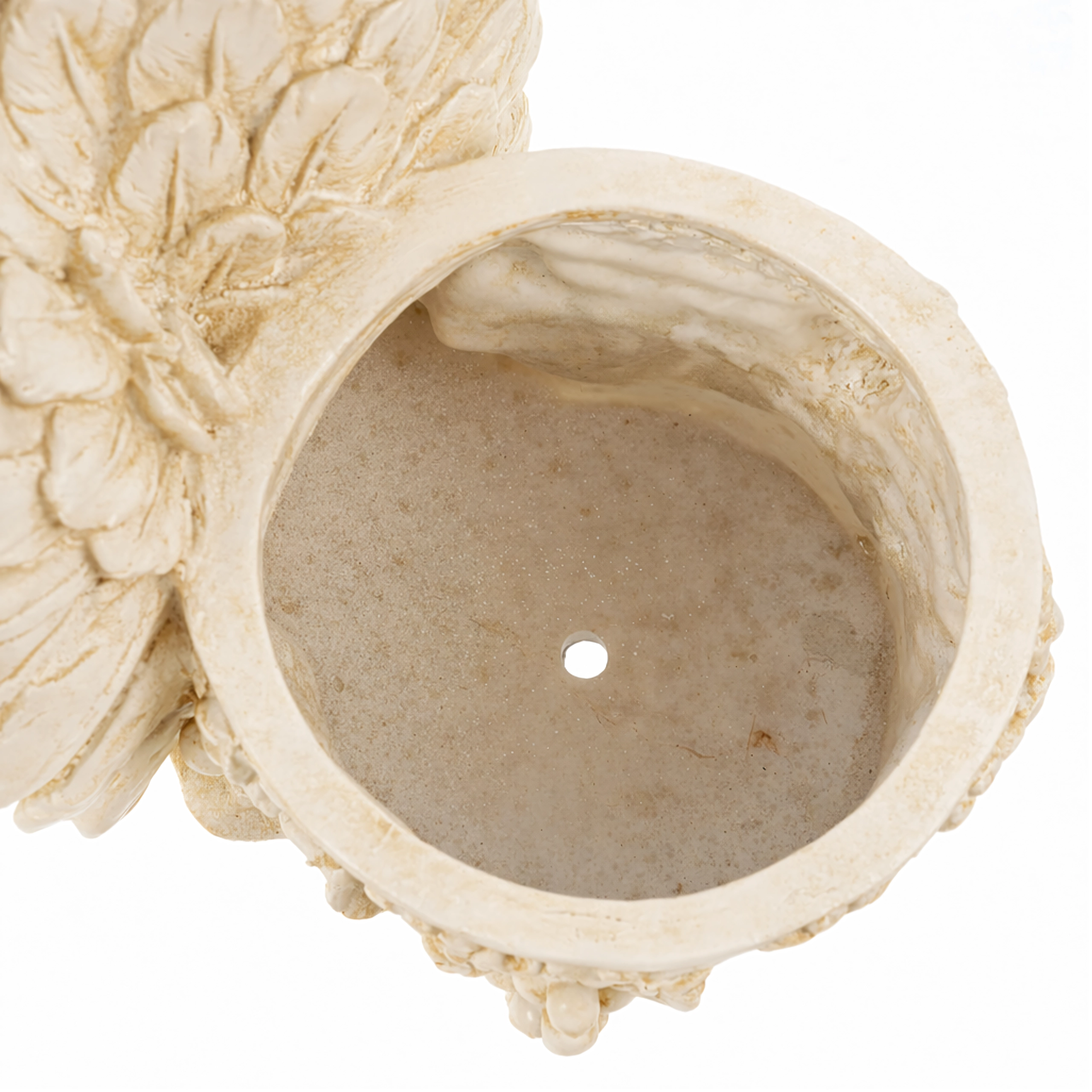Elegáns, díszes virágtartó alvó angyal motívummal, amely a kertben és otthon is remekül mutat. Részletgazdag domborműves kidolgozás, vintage kőhatás és praktikus hely növényeknek vagy gyertyának. Ideális romantikus kerti dekorációként, fűszernövényekhez és pozsgásokhoz, valamint ajándék-összeállításokhoz.