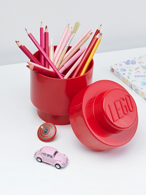 Vigyen rendet és játékos dizájnt a szobába az ikonikus LEGO kocka által ihletett kerek tárolódobozzal. A kompakt méreteknek köszönhetően remekül illik íróasztalra, polcra vagy a gyereksarokba, és megbízhatóan elnyeli az írószereket, apró játékokat vagy építőkészlet-elemeket.