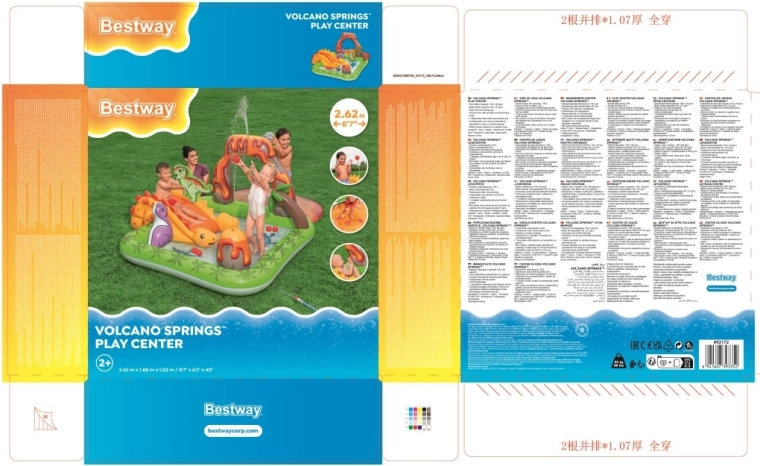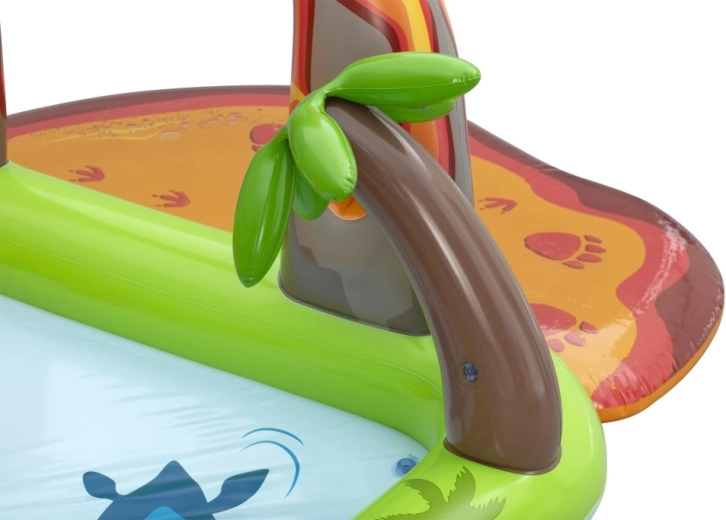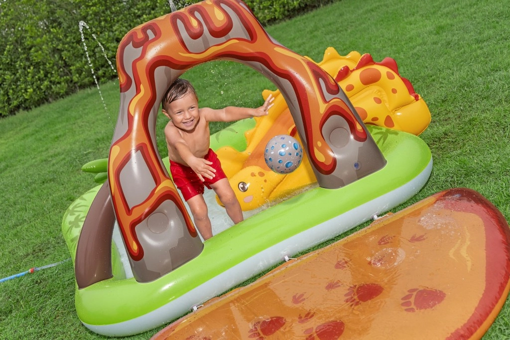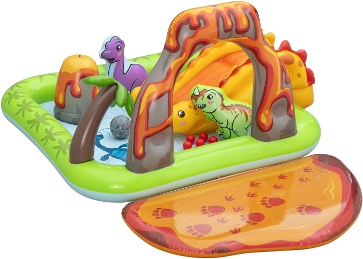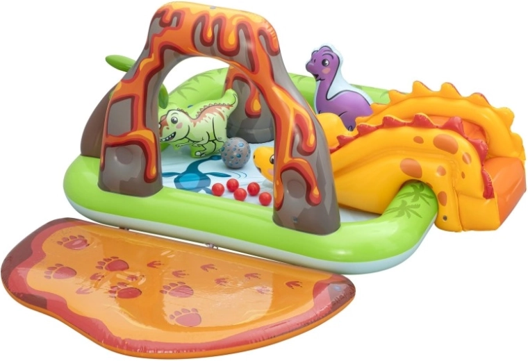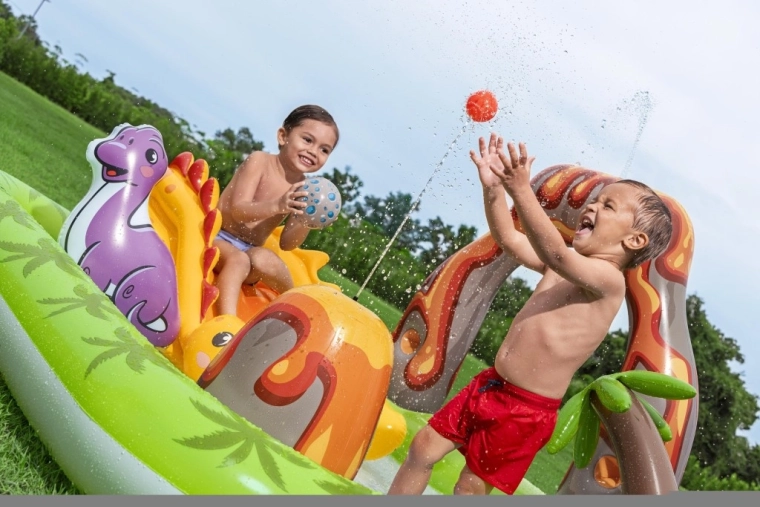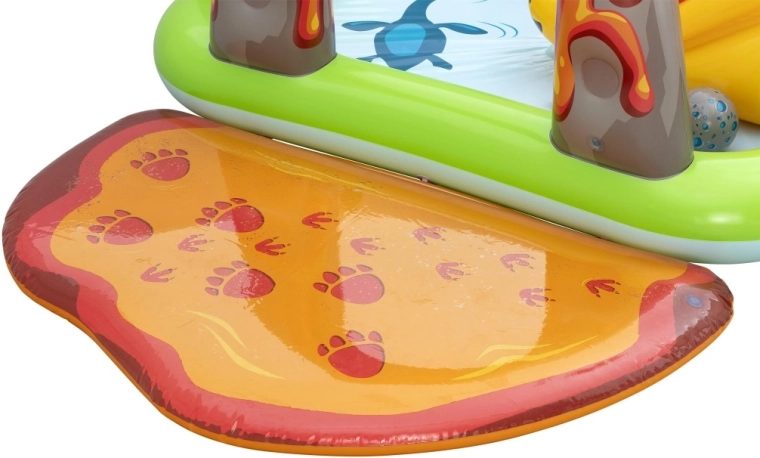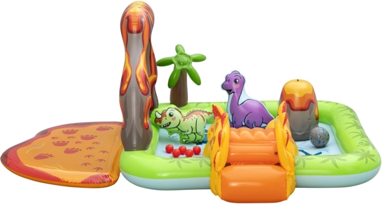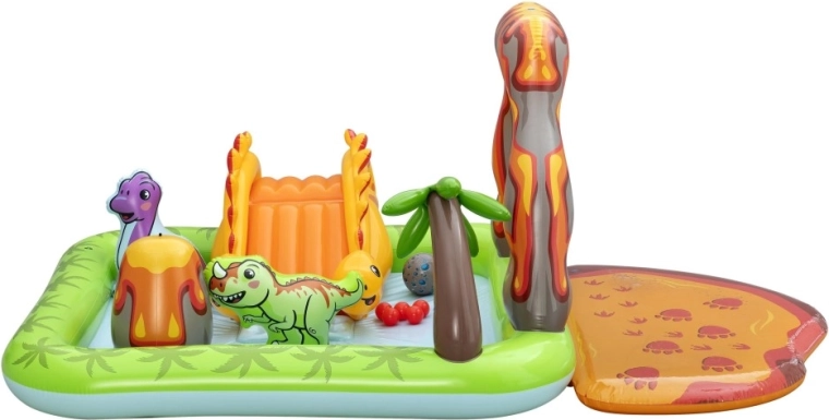 A központ része a sárga dínó csúszdával, két felfújható zöld és lila dinoszaurusz mint játékszereplők, nyílás a „vulkánon” a labdadobáláshoz, valamint puha leszálló párna a biztonságos érkezéshez. A minőségi vinilnek, a sima varratoknak és a lekerekített széleknek köszönhetően a játék kényelmes és biztonságos. A gyors felfújás, a könnyű leeresztés és a mellékelt javítófolt megkönnyíti a karbantartást és a tárolást.