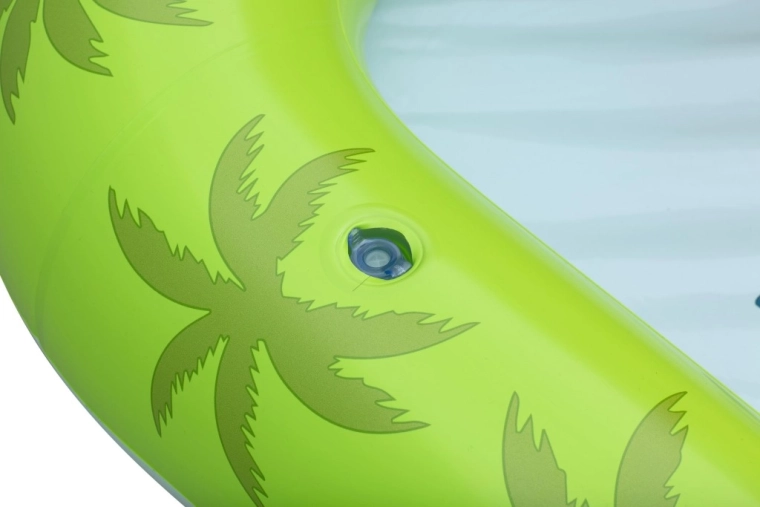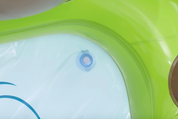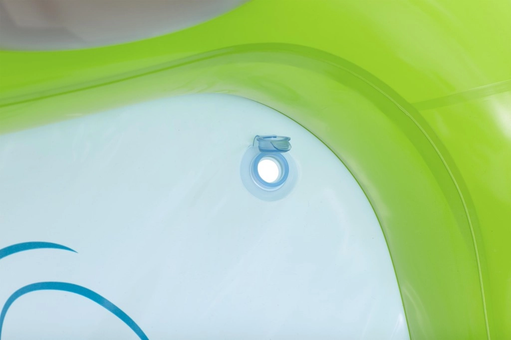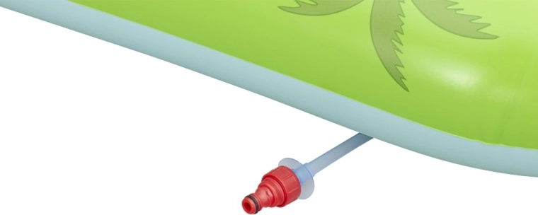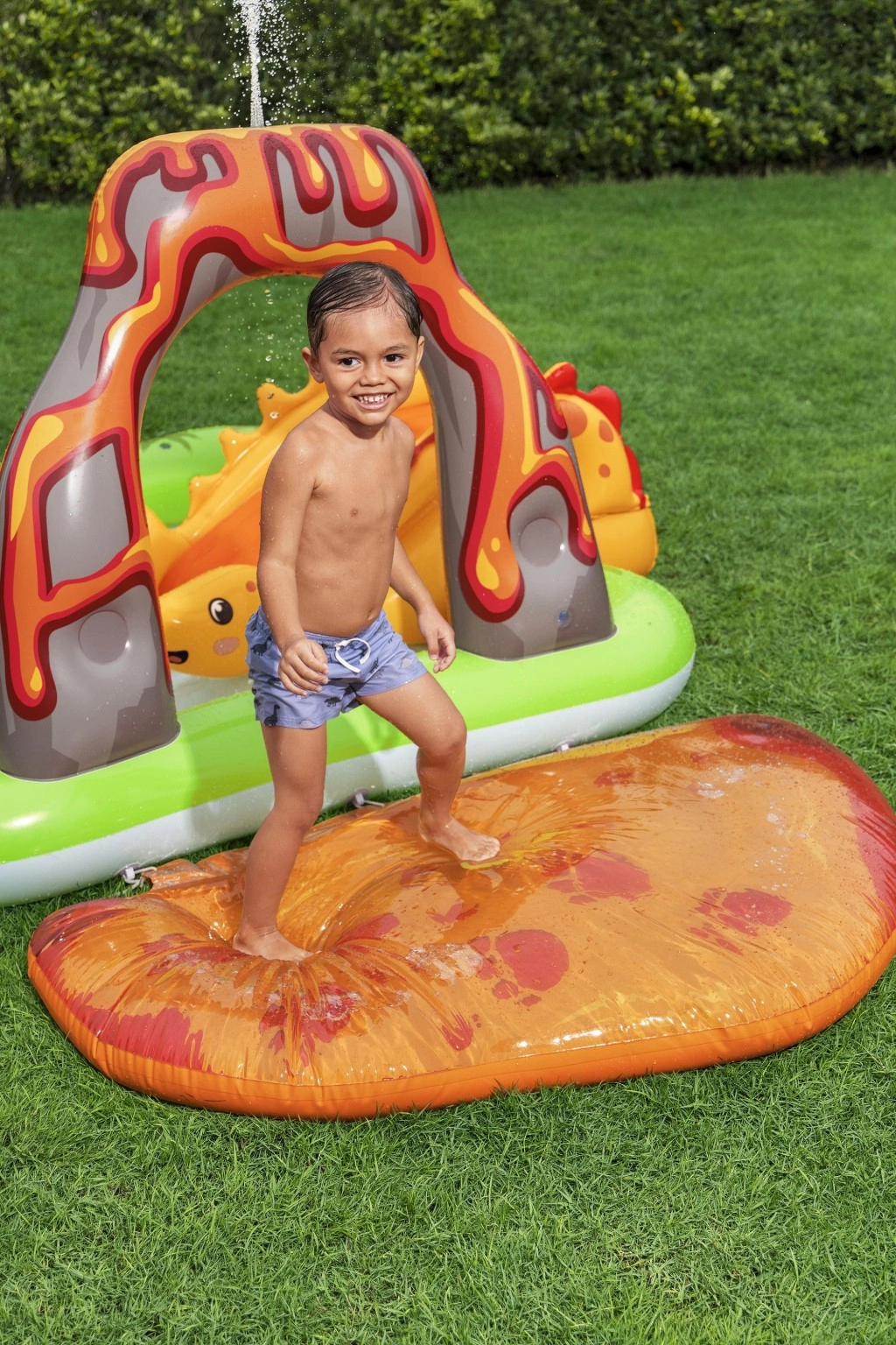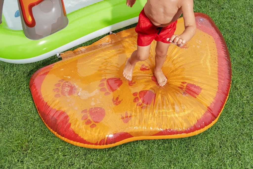 A felfújható dinoszauruszos játszóközpont ideális választás aktív nyári szórakozáshoz 2 éves kortól. A pálmával mintázott zöld medence kék aljzattal kb. 150 l vizet fogad, míg a különálló, lávamintás vizes szőnyeg további 80 l-t ad a puha érkezéshez és a játékos taposáshoz. A vulkáni ívbe épített permetezőt egyszerűen csatlakoztatod a kerti tömlőhöz, és pillanatok alatt frissítő zuhanyt varázsolsz.