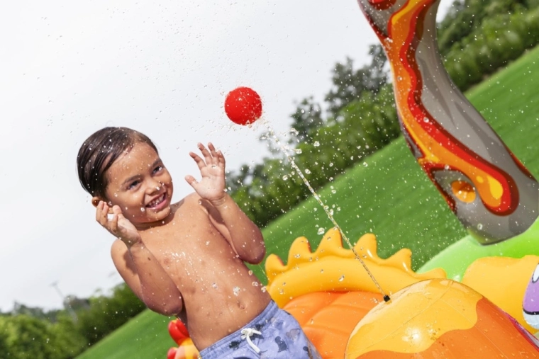 Dobáljátok a labdákat a vulkáni nyíláson át, fedezzétek fel a dinoszaurusz figurákat, és fejlesszétek a fantáziát és a mozgáskoordinációt játékos vizes tevékenységekkel.