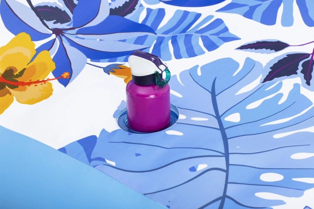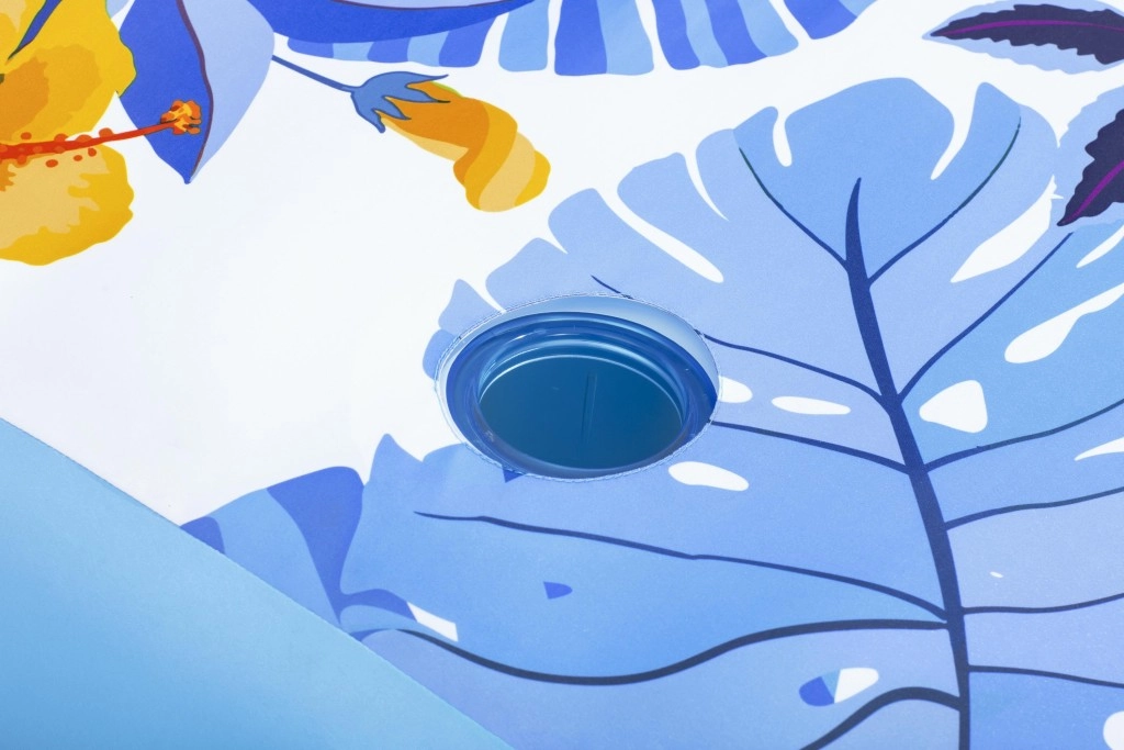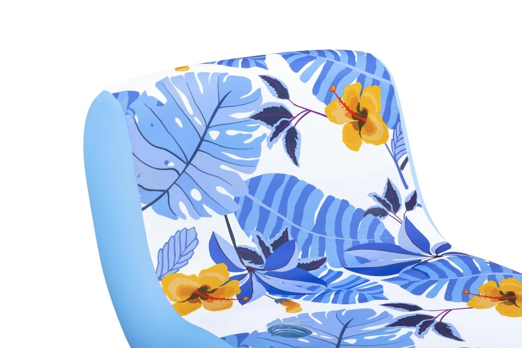A felületet levehető textil huzat borítja kék levelek és sárga virágok trópusi mintájával. A huzat könnyen mosható gépben, és UPF 50+ UV-védelemmel kezelt, így hosszú távon megőrzi élénk színeit. A tartós PVC test és a két különálló légkamra növeli a stabilitást, a biztonságot és az ellenállóságot a mindennapi igénybevétellel szemben.
