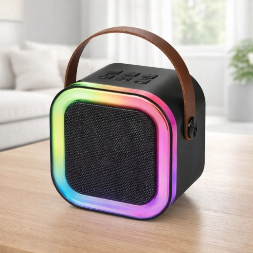 A kocka hangszóró többszínű LED gyűrűje feldobja a hangulatot. A pántnak köszönhetően könnyedén magaddal viheted bárhová – a nappaliból a kertbe.