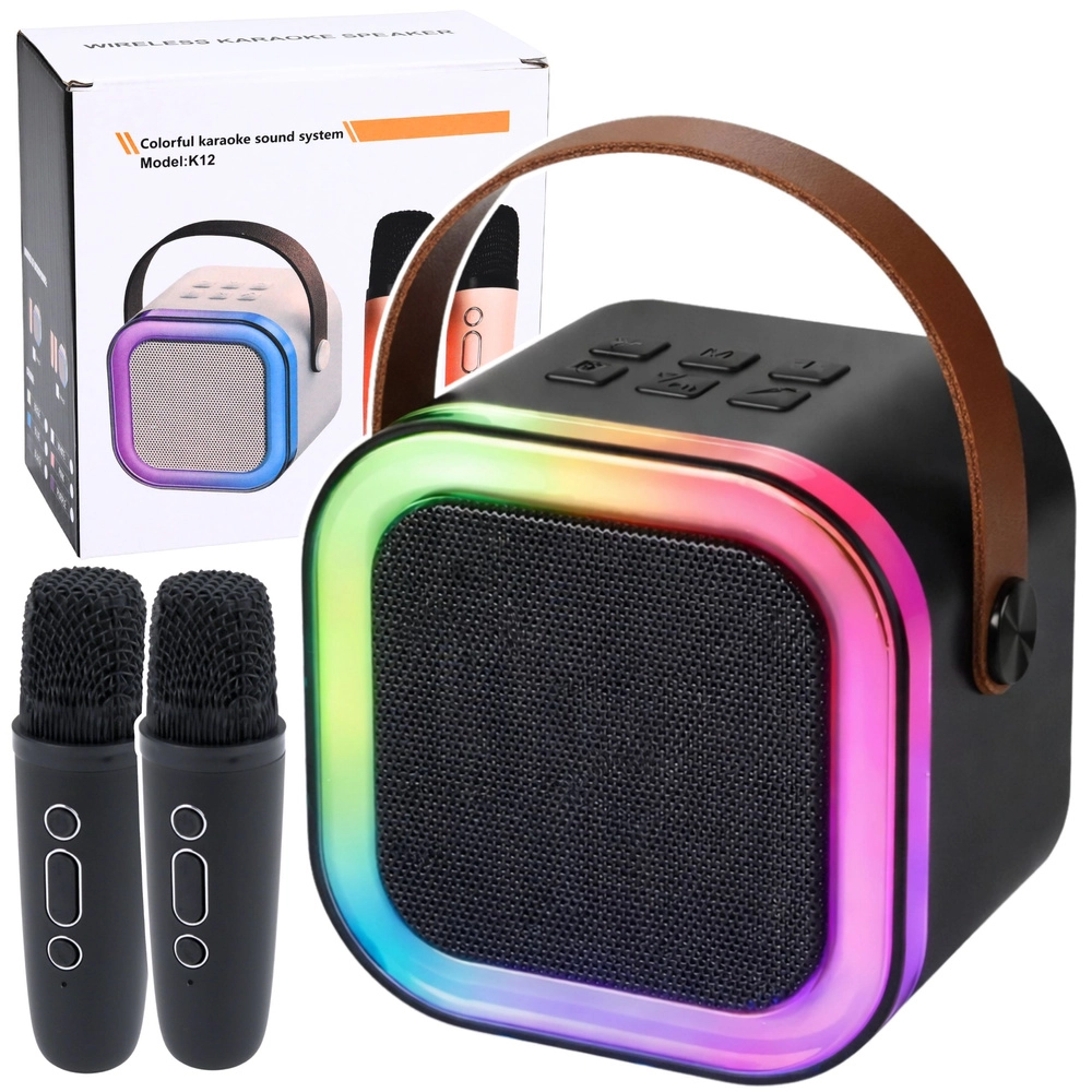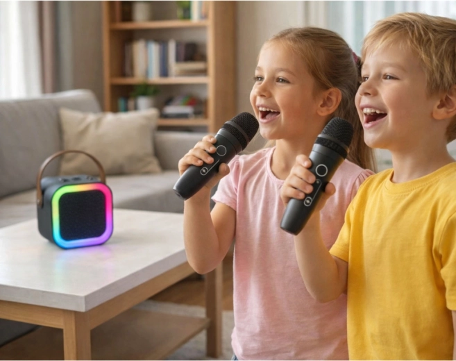 Kompakt vezeték nélküli karaoke szett hordozható hangszóróval és két mikrofonnal, amely szórakozást visz a bulikba, otthonra és az ünnepségekre. Kínál Bluetooth-ot, lejátszást USB- és TF-kártyákról, látványos LED háttérvilágítást és beépített akkumulátort az igazán mobil használathoz. A tiszta és dinamikus hangzást zajcsökkentés és digitális feldolgozás támogatja a minden dalnál profi élményért.