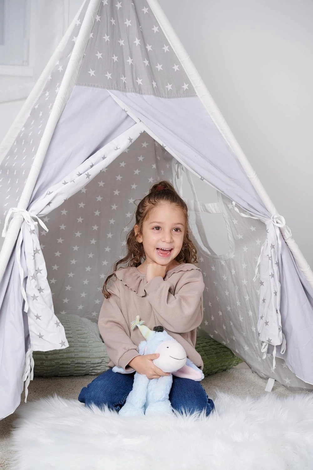 Az ülő kivitel jól tartja a formáját, így polcra, olvasókuckóba vagy teepee sátorba is tökéletes. Szép dekoráció és játék egyben.