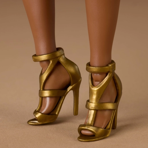 A stílus semleges, időtálló árnyalatokra épül arany akcentusokkal – a csillogó arany ruha visszafogott sminkkel és finom részletekkel egészül ki. A baba kompatibilis a BARBIE kiegészítőkkel, és kiválóan illeszkedik kreatív összeállításokhoz és stílusmixekhez.