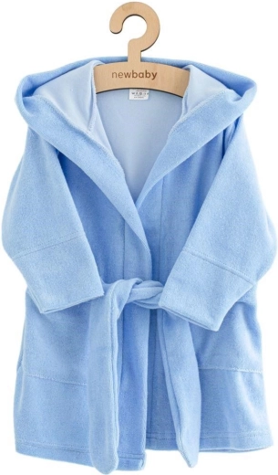 Puha és meleg New Baby gyerek frottír köntös kék színben, amely maximális kényelmet biztosít fürdés után. Van kapucnija a fej védelmére, bevarrt öve, ami nem vész el, és mélyebb zsebei az apróságoknak. Ideális otthoni fürdéshez, uszodába és a tengerpartra is. 100% pamutból készült, OEKO-TEX STANDARD 100 tanúsítvánnyal.