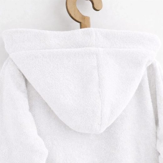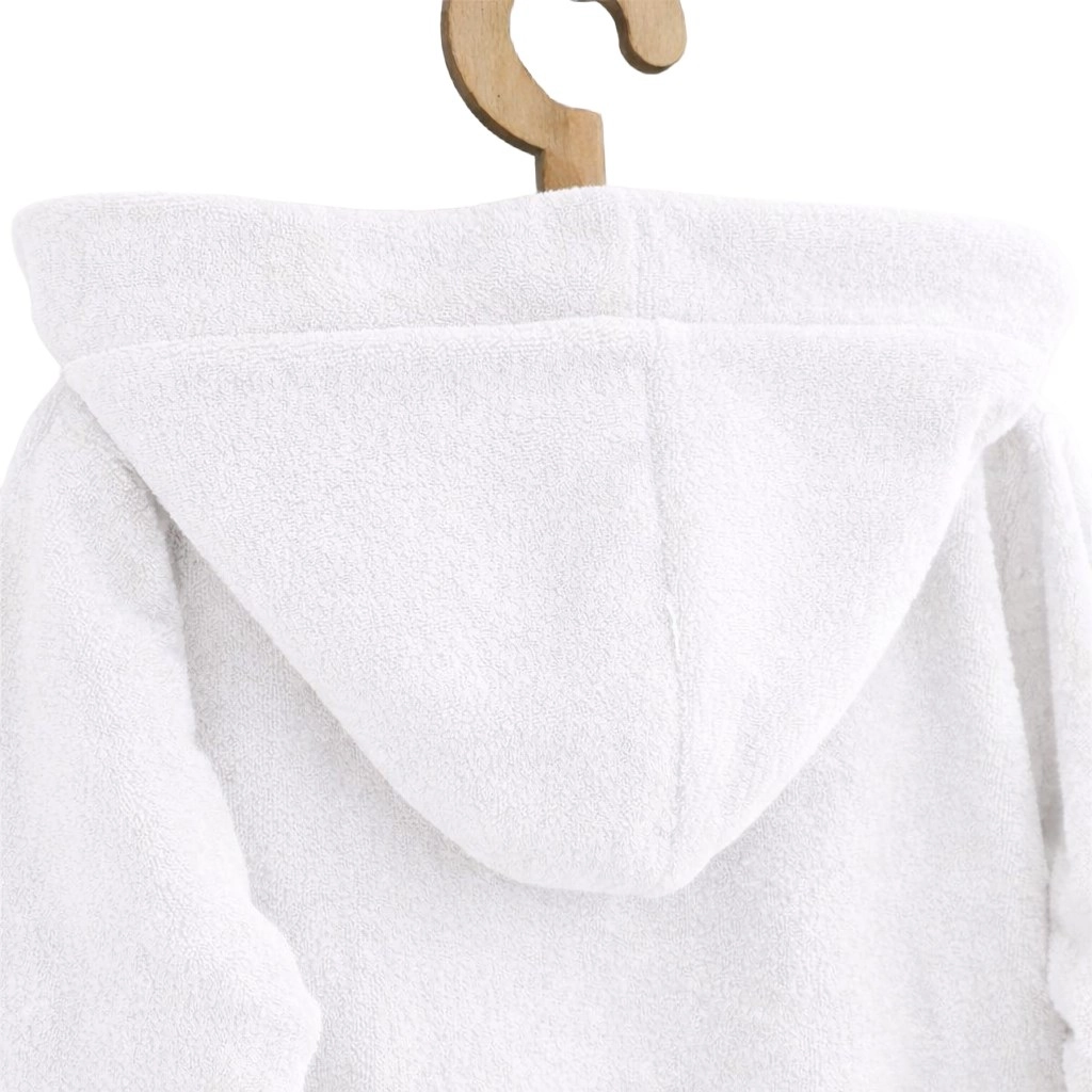 Puha és meleg gyermek köntös a New Baby márkától, minőségi frottírból a mindennapi kényelemhez fürdés után. A praktikus kapucni megóvja a nedves fejecskét a hidegtől, a bevarrt öv nem vész el, és a mélyebb zsebek apróságoknak adnak helyet. 100% pamutból készült, OEKO-TEX STANDARD 100 tanúsítvánnyal, 240 g/m² grammázzsal. Méret 92/98, fehér színben.