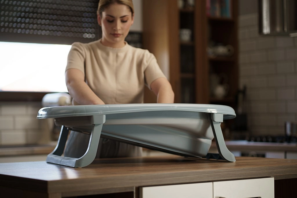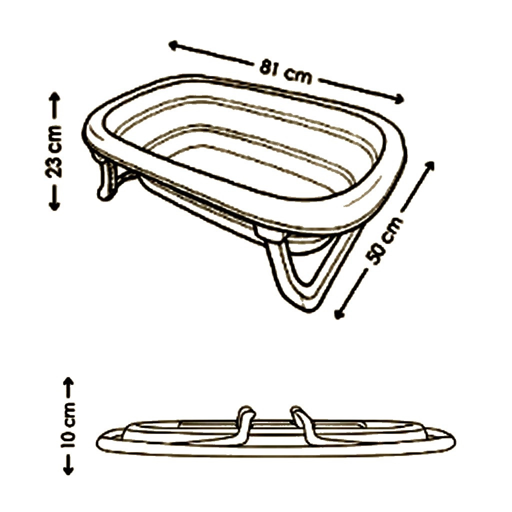 Az ergonomikusan tervezett kád könnyen összecsukható körülbelül 10 cm magasságra, így helytakarékos a fürdőszobában és az otthonban. A stabil műanyag lábak egyszerűen a kád alá hajthatók, és garantálják a biztonságos, szilárd elhelyezést a fürdetés alatt.