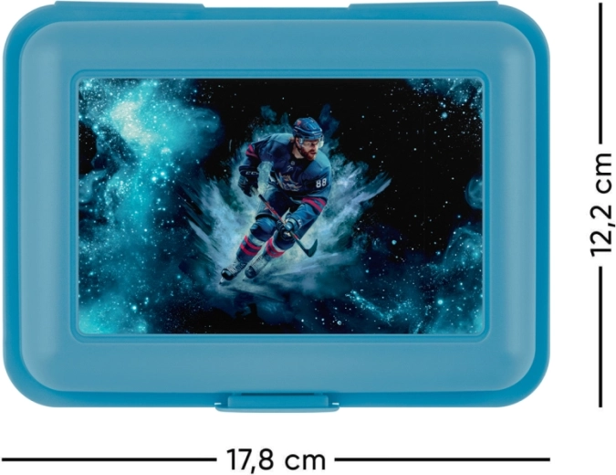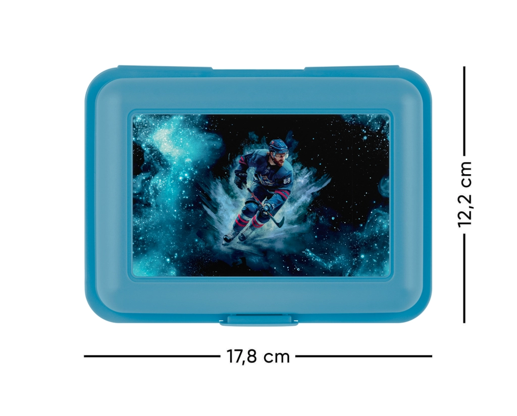 Praktikus uzsonnás doboz kicsi és nagy sportolóknak. Kék kivitelben Jégkorong motívummal, egy záras biztonságos záródással és osztólappal az ételek áttekinthető elrendezéséhez. Tartós műanyag kivitel a mindennapi használathoz.