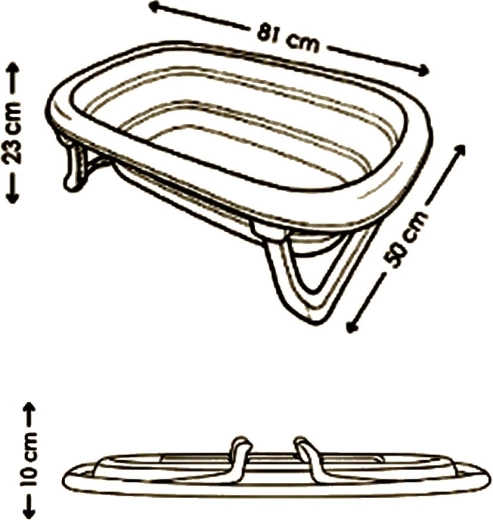 A kád merev polipropilén alsó részt kombinál a rugalmas elasztomer résszel az egyszerű összecsukhatóságért. A kihajtható lábakkal és megemelt peremekkel ellátott konstrukció biztos tartást nyújt sík felületen. A termék kompakt csomagolásban érkezik, szállításra és tárolásra készen.