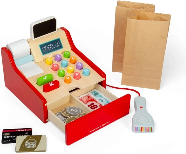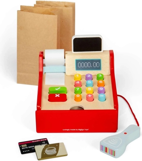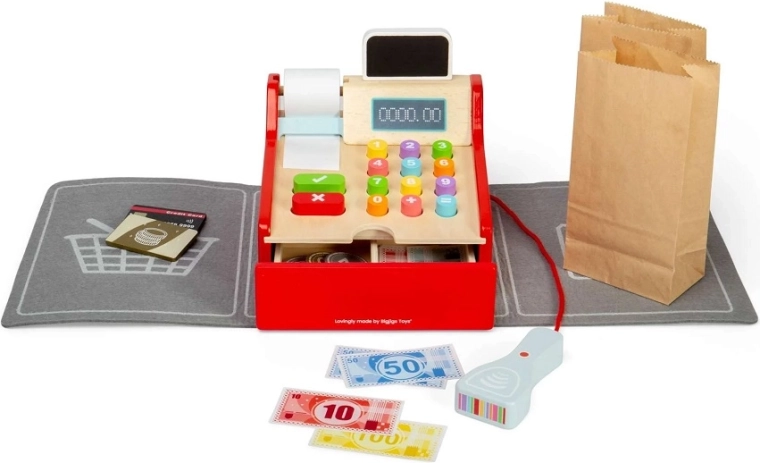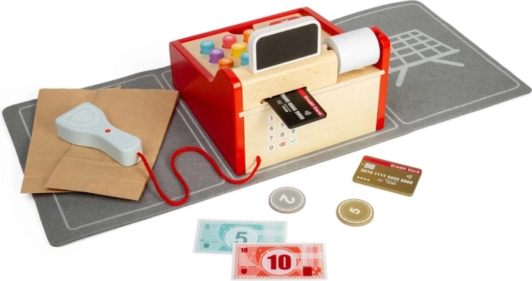 Stílusos fa pénztárgép kis eladóknak, amely minden gyerekboltot valódi üzletté varázsol. A gyerekek be tudják szkennelni az árut, kiszámolhatják az árakat, kiállíthatnak nyugtát, és fogadhatnak kártyás és készpénzes fizetést. A kicsi kezekhez tervezett nagy gombok, a mellékelt szkenner és a tartozékok támogatják a szerepjátékot, a kommunikáció, a szociális készségek és a pénzügyi műveltség fejlődését. FSC® fából készült – környezetkímélő és strapabíró a mindennapos játékhoz.