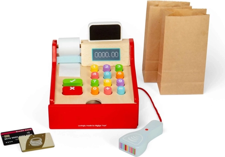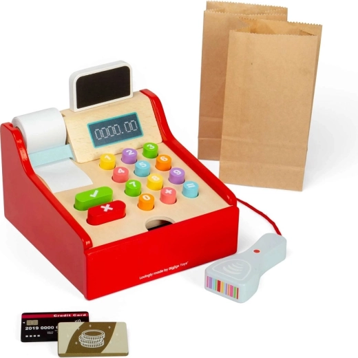 Ajándékozzon a gyerekeknek autentikus vásárlási élményt. A BIGJIGS TOYS fa pénztárgép színes, könnyen megnyomható gombokat, kézi szkennert, nyugtahelyet és „pénz”-fiókot kínál. A valósághű elemek serkentik a képzelőerőt, és természetes módon vezetnek a számolás és az egyszerű fizetések gyakorlásához.