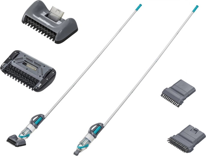 A csomagban két cserélhető tisztítófej található különböző felületekhez, a sík aljtól a sarkokig és lépcsőkig. A moduláris, 2 m hosszú rúd kényelmes elérést biztosít hajolgatás nélkül; leválasztva az AquaGrip fürge kézi porszívóvá válik a részletes tisztításhoz. A LED fény rosszabb körülmények között is áttekinthetőbbé teszi a munkát.