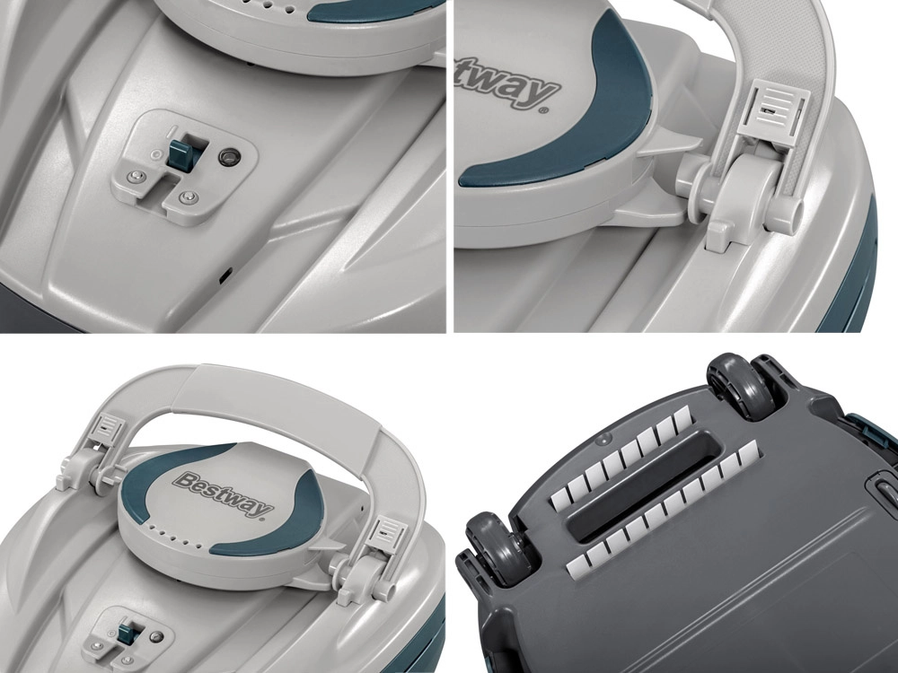 A BESTWAY AquaTronix G150 robotporszívó kényelmes és hatékony medencekarbantartást nyújt a teljesen vezeték nélküli működésnek köszönhetően. Az intelligens vízérzékelők és az irányfúvókák megbízható mozgást biztosítanak az aljon, valamint automatikus bekapcsolást merítéskor és kikapcsolást kiemeléskor. A nagy, 2,0 l űrtartalmú szűrőkosár néhány másodperc alatt könnyen kivehető és kiüríthető.