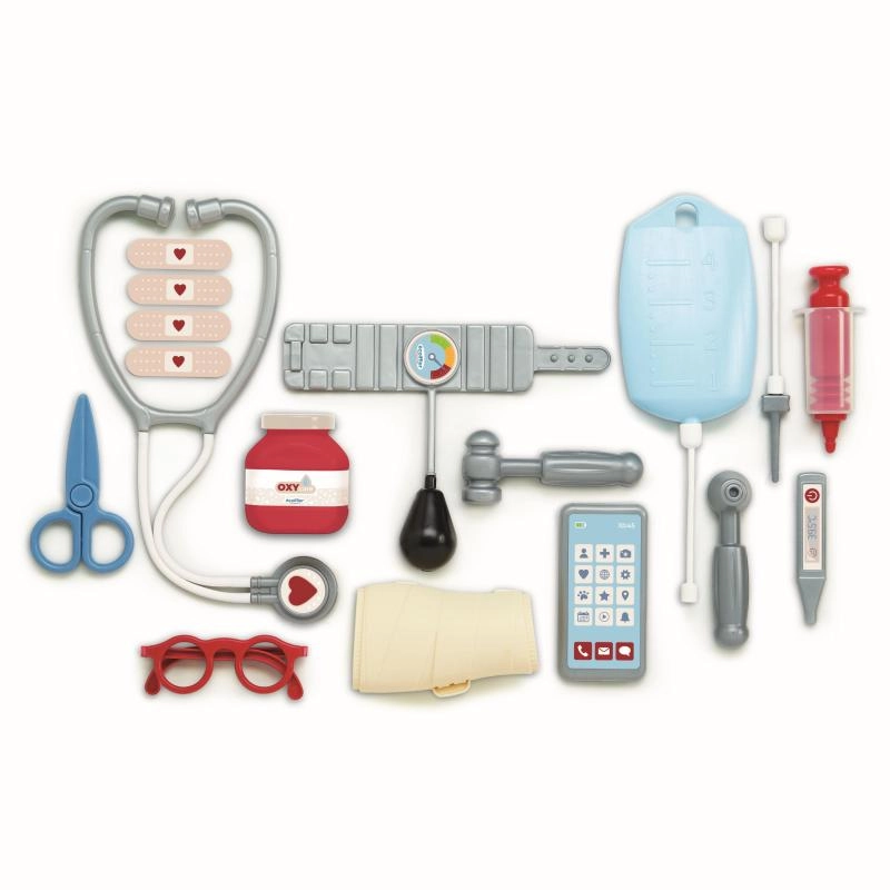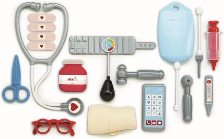 - 17 db (sztetoszkóp, szemüveg, telefon, vérnyomásmérő, otoszkóp, reflexkalapács, gyógyszeres üvegcse, hőmérő, infúziós tasak, injekciós fecskendő, gipszsín, olló, 4× sebtapasz)