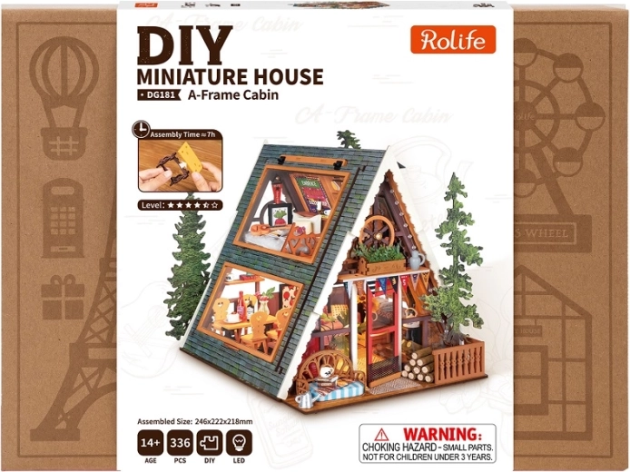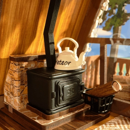 Varázsolj modern glamping hangulatot otthonodba. Az oromtetős kunyhó modellje lenyűgöző nagyméretű üvegfalakkal, nyitható ablakkal és átgondolt belsővel készül: napfényes nappali, teljesen felszerelt étkező, fa lépcső és tetőtéri háló. Nem hiányzik a erkély minikerttel, a fatüzelésű kemence, a dekoratív keretek és a gitár sem – minden apróság örömet okoz a miniatűrök rajongóinak.