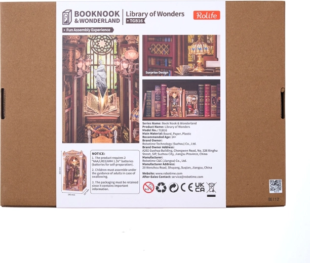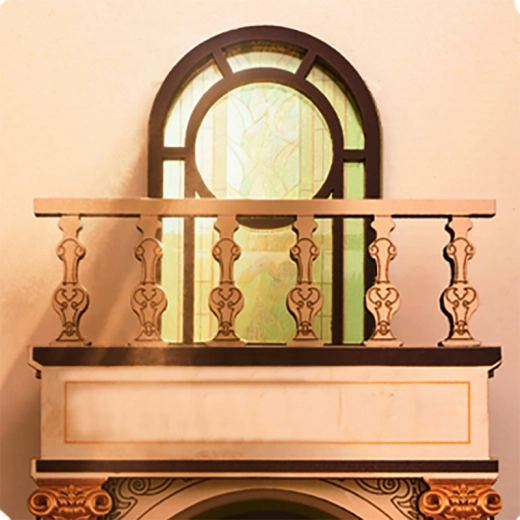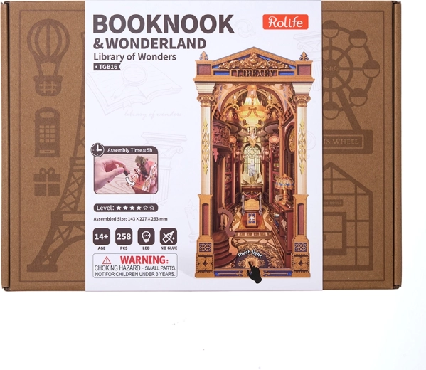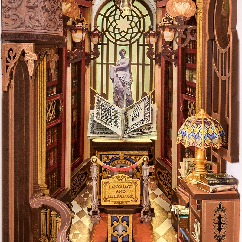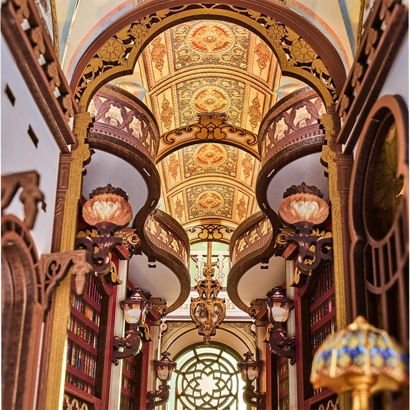 Ez a lenyűgöző book nook a viktoriánus építészetet, római oszlopokat, erkélyeket és üvegablakokat egyesíti hangulatos miniatűr jelenetté. Belül vörös fa könyvszekrények, boltíves kapu, mahagóni pult nyitott könyvvel és működő LED csillár gondoskodik a meghitt megvilágításról.