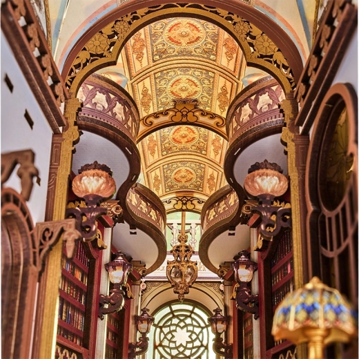 Díszítések, boltíves mennyezetek, oszlopok és gazdagon ékesített erkélyek idézik a klasszikus könyvtár hangulatát – a részletgazdag kivitel minden dizájnrajongót elbűvöl.